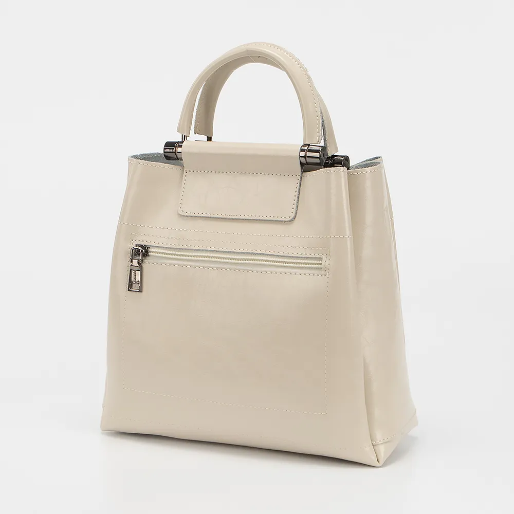 Сумка от торговой марки Poshete из натуральной кожи бежевого цвета. Модель с двумя ручками и съемным регулируемым плечевым ремнем. Основное отделение на молнии, боковые - на магнитной кнопке. Внутри: частичная текстильная подкладка, карман на молнии, накладной карман. На задней стороне - карман на молнии. Дно оснащено металлическими ножками для защиты от износа.