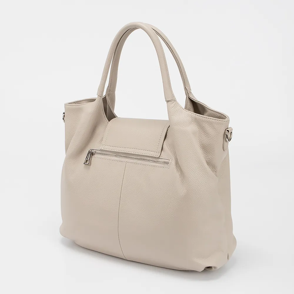 Сумка от торговой марки Poshete из натуральной кожи светло-серого цвета. Вместительная модель с двумя ручками и съемным регулируемым плечевым ремнем. Клапан на поворотном замке закрывает отделение на молнии. Внутри: фирменная подкладка, карман и средник на молнии, накладной карман. На задней стороне - карман на молнии. Дно оснащено металлическими ножками для защиты от износа