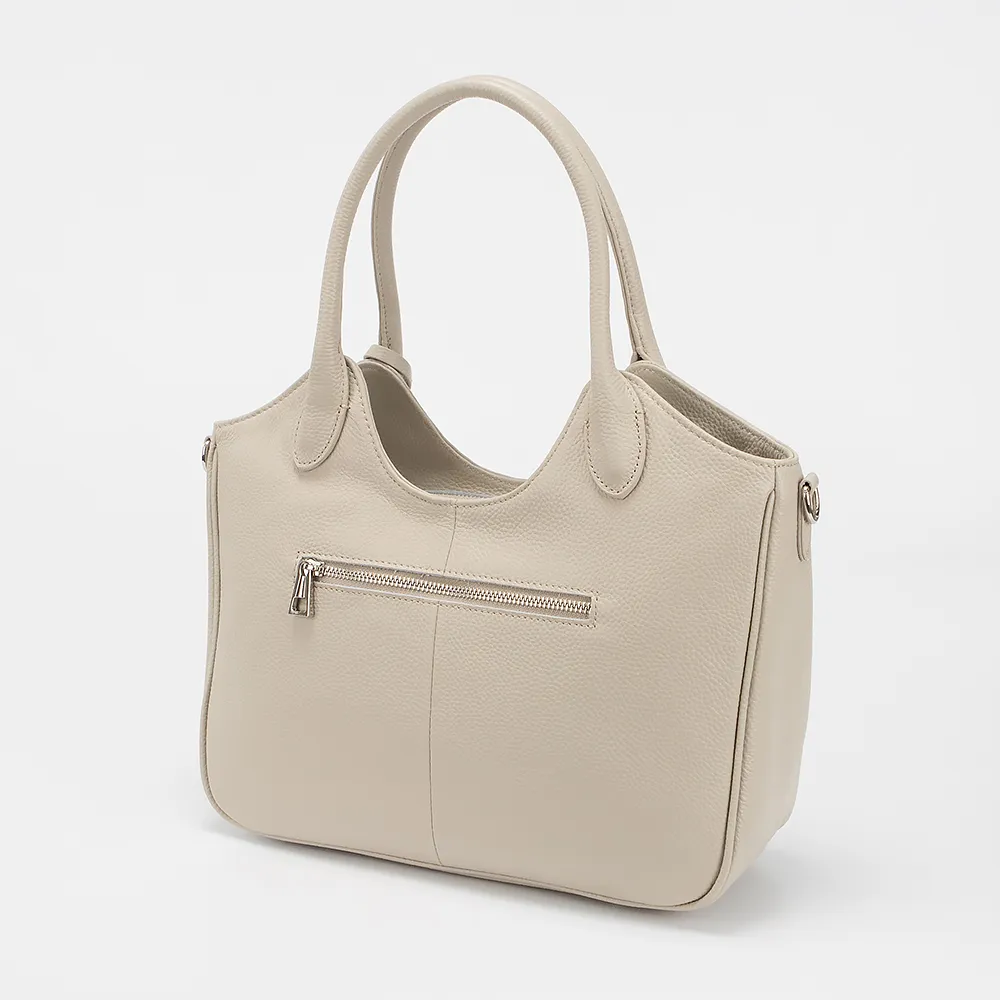 Сумка от торговой марки Poshete из натуральной кожи бежевого цвета. Модель с двумя длинными ручками и съемным регулируемым плечевым ремнем. Декорирована подвеской из натуральной кожи. Отделение на молнии. Внутри: фирменная подкладка, карман и средник на молнии, накладной карман. Дно оснащено металлическими ножками для защиты от износа.