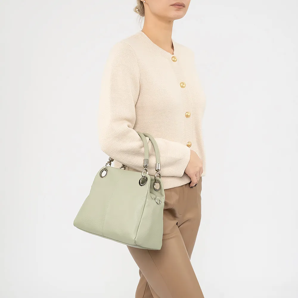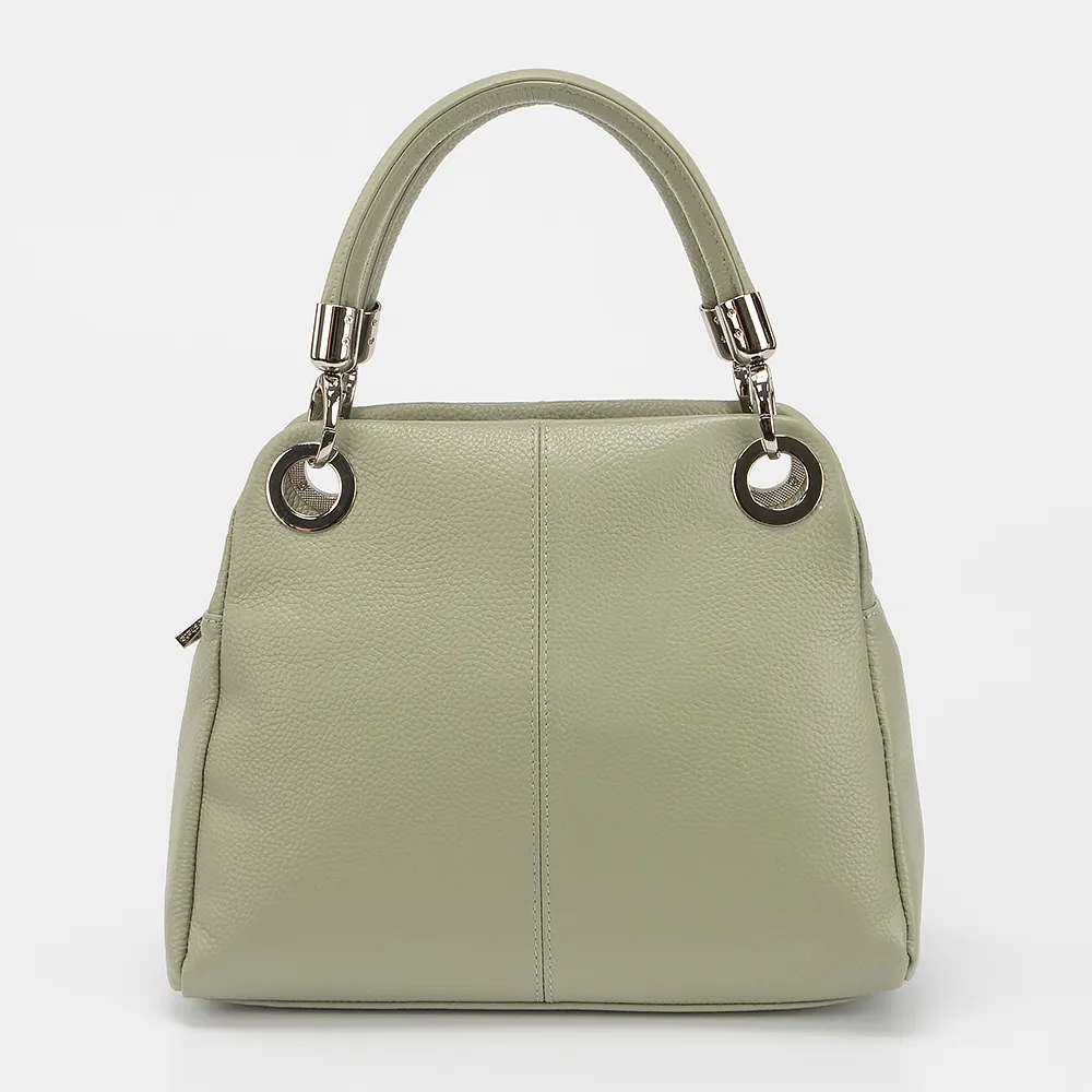 Сумка от торговой марки Poshete из натуральной кожи зеленого цвета. Модель среднего размера с двумя плотными ручками на люверсах и съемным регулируемым плечевым ремнем. Два отделения на молнии, с фирменной подкладкой. В заднем - карман на молнии, в переднем - два накладных кармана. На задней стороне - карман на молнии.