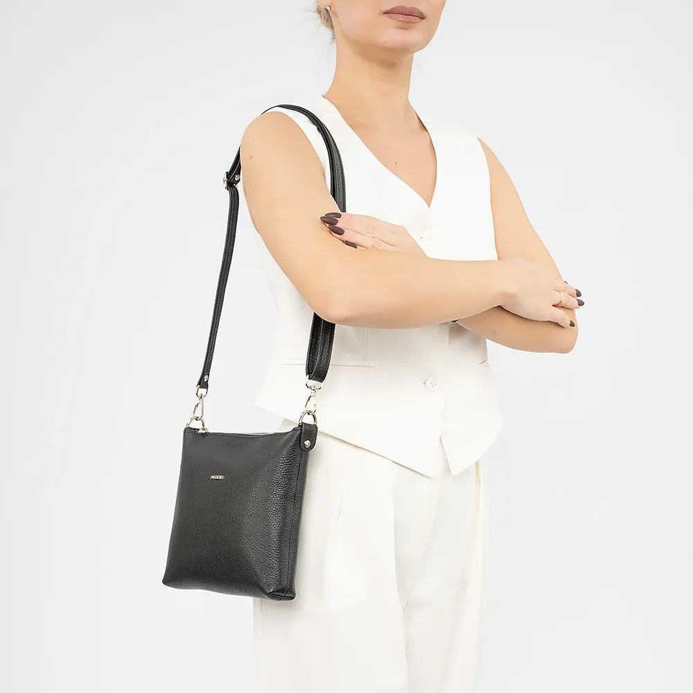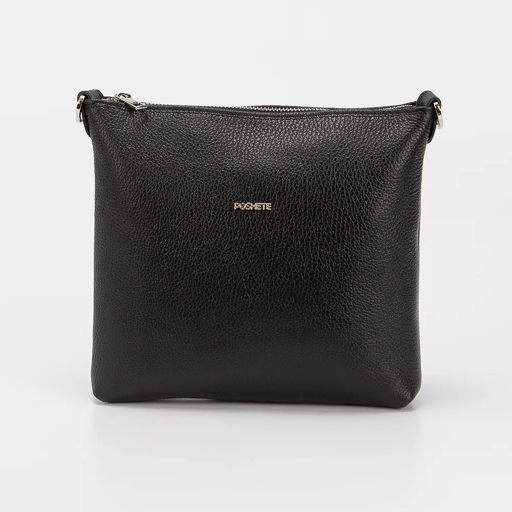 Сумка-планшет от торговой марки Poshete из натуральной кожи черного цвета. Плоская квадратная модель со съемным регулируемым плечевым ремнем. Отделение на молнии. Внутри: текстильная подкладка, карман на молнии. На задней стороне - карман на молнии.
