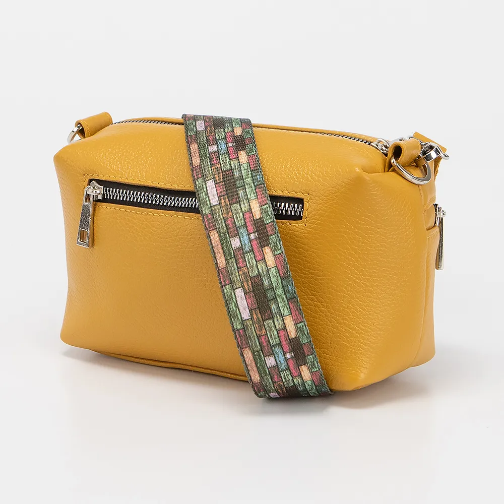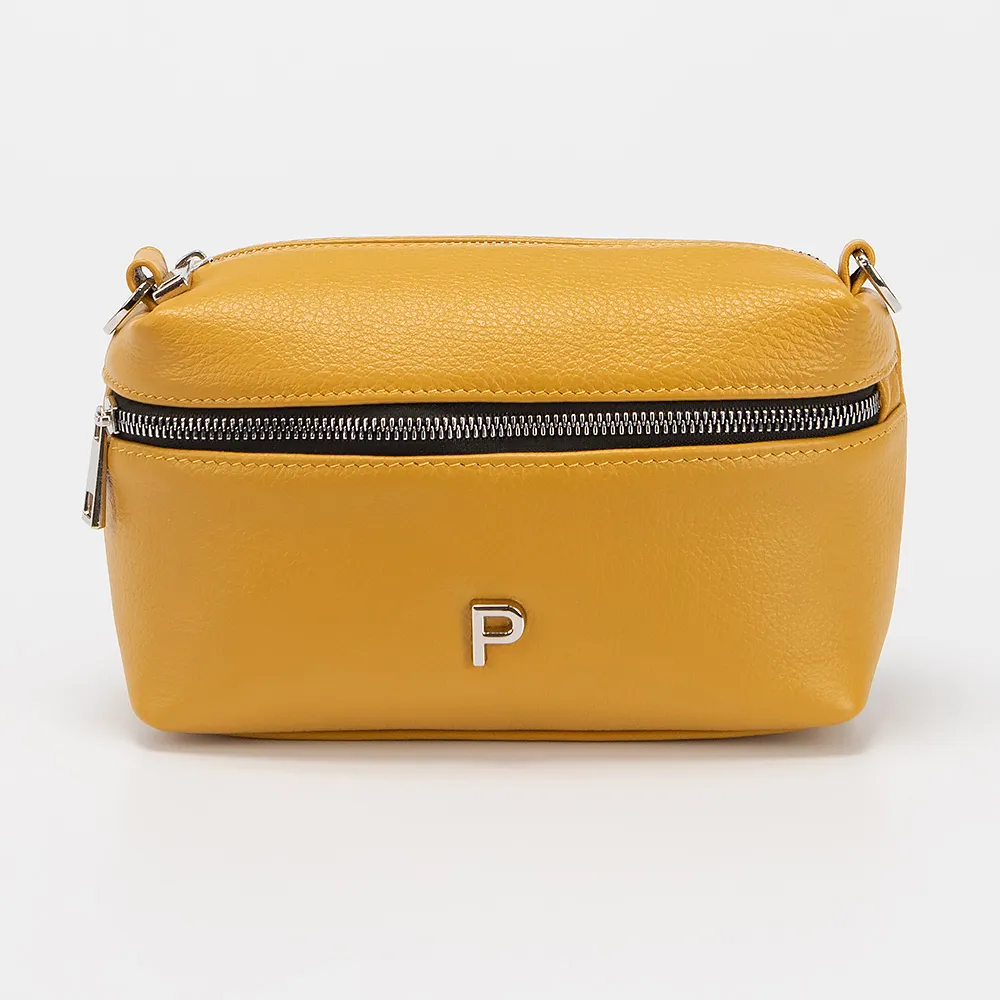 Сумка от торговой марки Poshete из натуральной кожи желтого цвета. Компактная модель со съемным регулируемым плечевым ремнем, выполненным из текстильного материала с оригинальным рисунком. Отделение на молнии. Внутри: фирменная подкладка, карман на молнии, накладной карман. На лицевой и задней сторонах - карман на молнии.