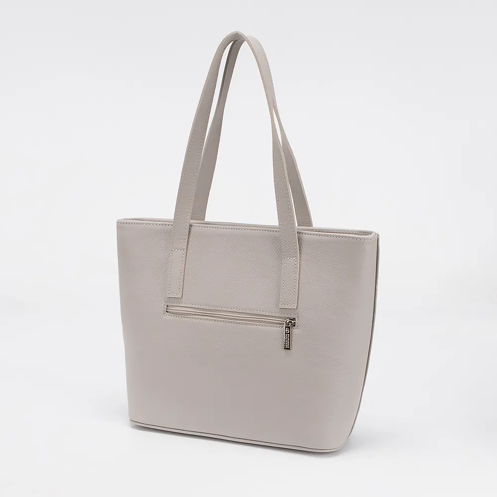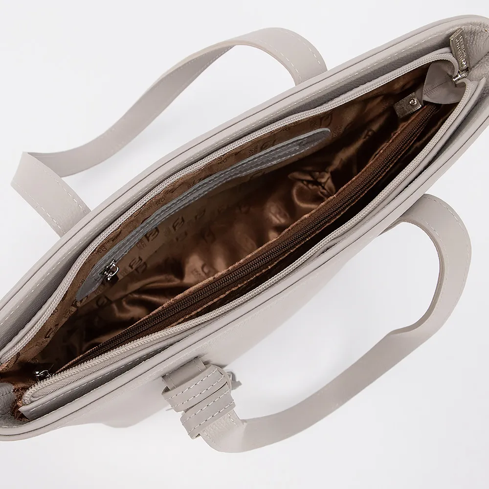 Сумка от торговой марки Francesco Molinary из натуральной кожи серого цвета. Модель с двумя удлиненными ручками, декорированными подвеской с кисточками. Отделение на молнии. Внутри: фирменная подкладка, средник и карман на молнии. На задней стороне - карман на молнии. Дно оснащено металлическими ножками для защиты от износа.