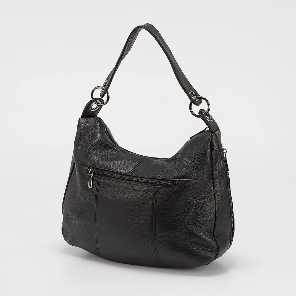 Сумка от торговой марки Poshete выполнена из натуральной кожи черного цвета. Модель с удлиненной ручкой. Отделение на молнии. Внутри: текстильная подкладка, два кармана на молнии, накладной карман. По бокам - вертикальные карманы на молнии. С задней стороны - карман на молнии.