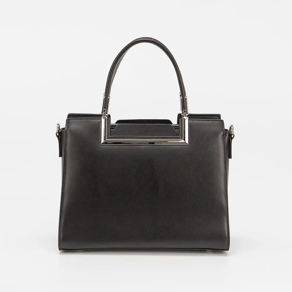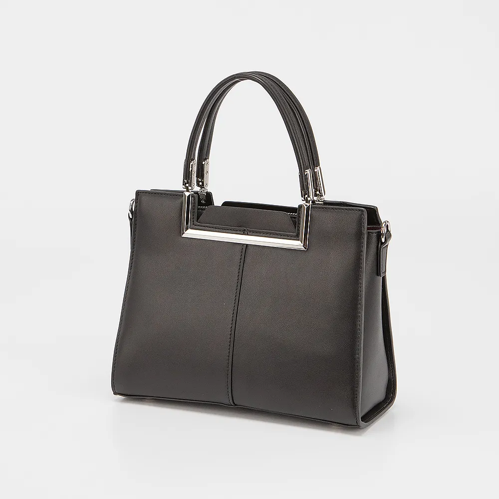 Сумка от торговой марки Poshete выполнена из натуральной кожи черного цвета. Модель с двумя ручками и съемным регулируемым плечевым ремнем. Основное отделение на молнии, без подкладки. Также имеется карман на магнитной кнопке. Дно оснащено металлическими ножками для защиты от износа.