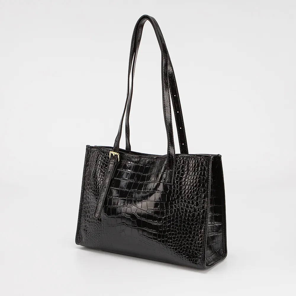 Сумка от торговой марки Francesco Molinary выполнена из натуральной кожи черного цвета с тиснением под рептилию. Модель с регулируемым плечевым ремнем. Отделение на магнитной кнопке. Внутри: три отсека, средний - на молнии, боковые без застежки. Дно оснащено металлическими ножками для защиты от износа.