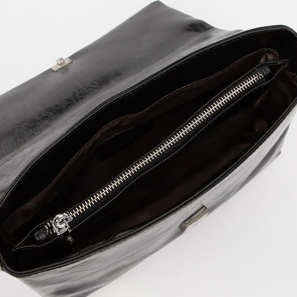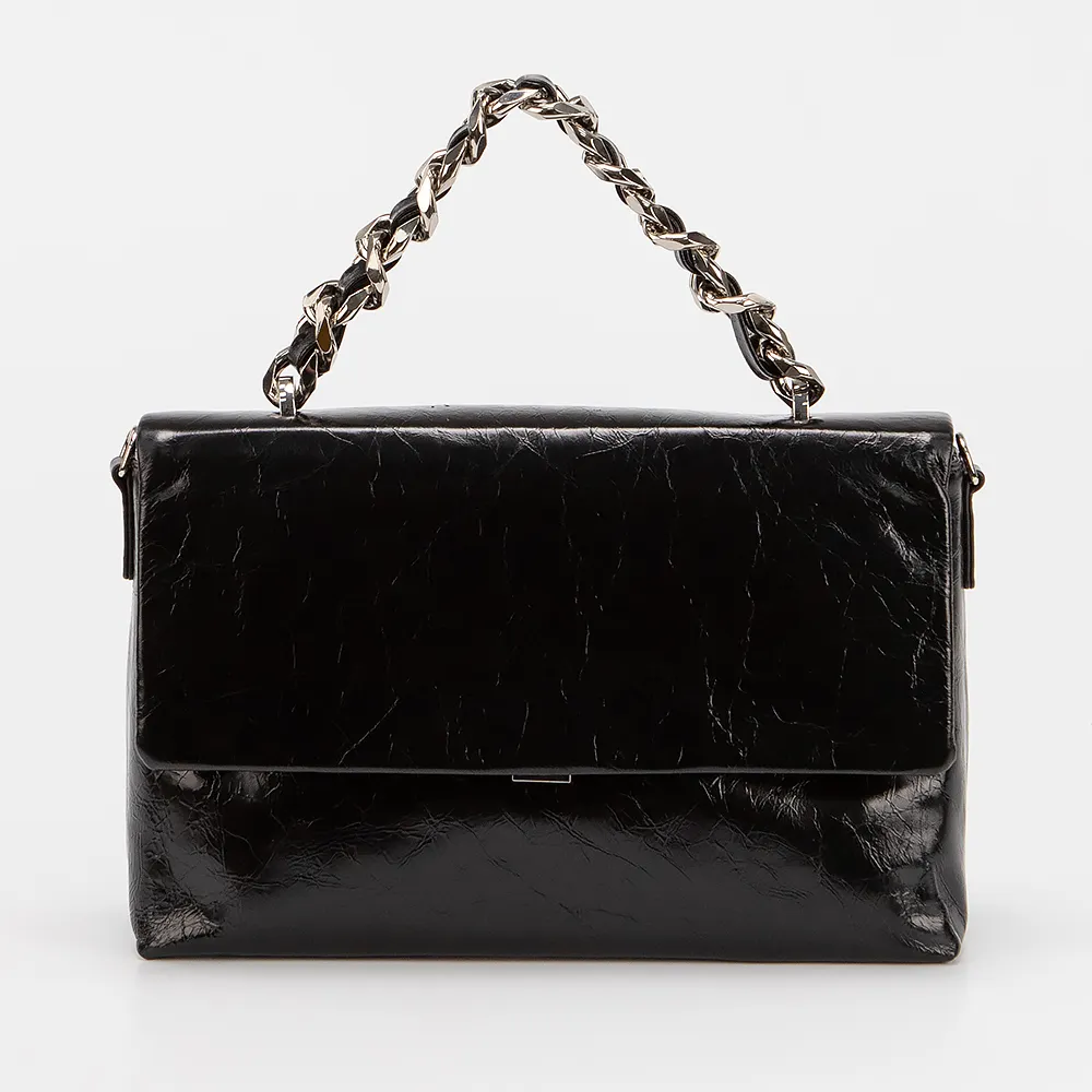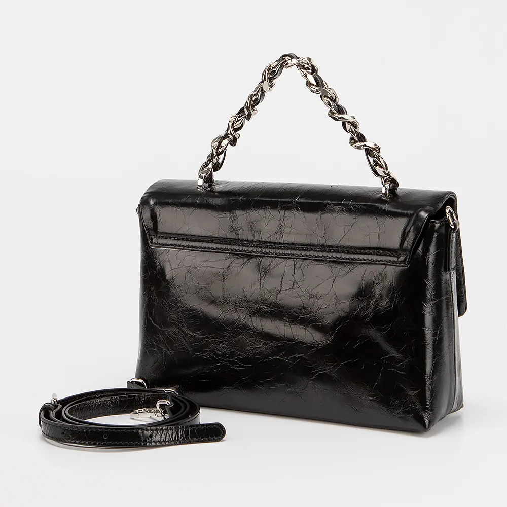 Сумка от торговой марки Poshete выполнена из натуральной кожи черного цвета. Модель с ручкой-цепочкой и съемным регулируемым плечевым ремнем. Клапан закрывает отделение с текстильной подкладкой. Внутри: средник и карман на молнии, накладной карман.