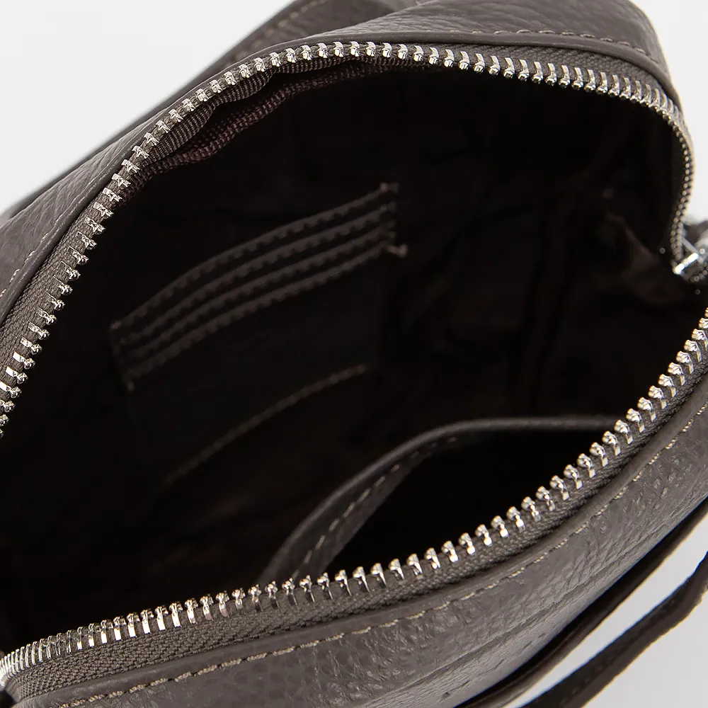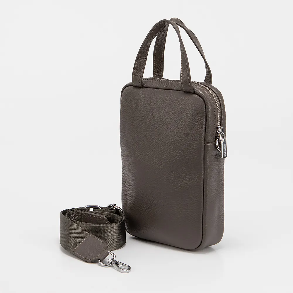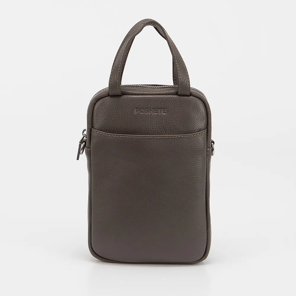 Сумка от торговой марки Poshete выполнена из натуральной кожи серого цвета. Компактная модель вертикальной ориентации с двумя ручками и съемным регулируемым плечевым ремнем. Отделение на молнии. Внутри: карманы для карт, накладной карман. С лицевой стороны - накладной карман.