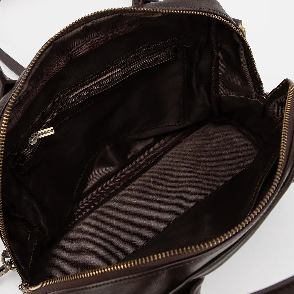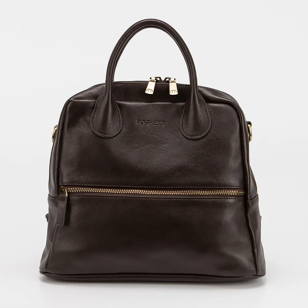 Сумка-рюкзак от торговой марки Poshete выполнена из натуральной кожи коричневого цвета. Модель с двумя ручками и плечевым ремнем, который трансформируется в плечевые лямки. Отделение на молнии. Внутри: текстильная подкладка, карман на молнии, накладной карман. С лицевой стороны - карман на молнии.