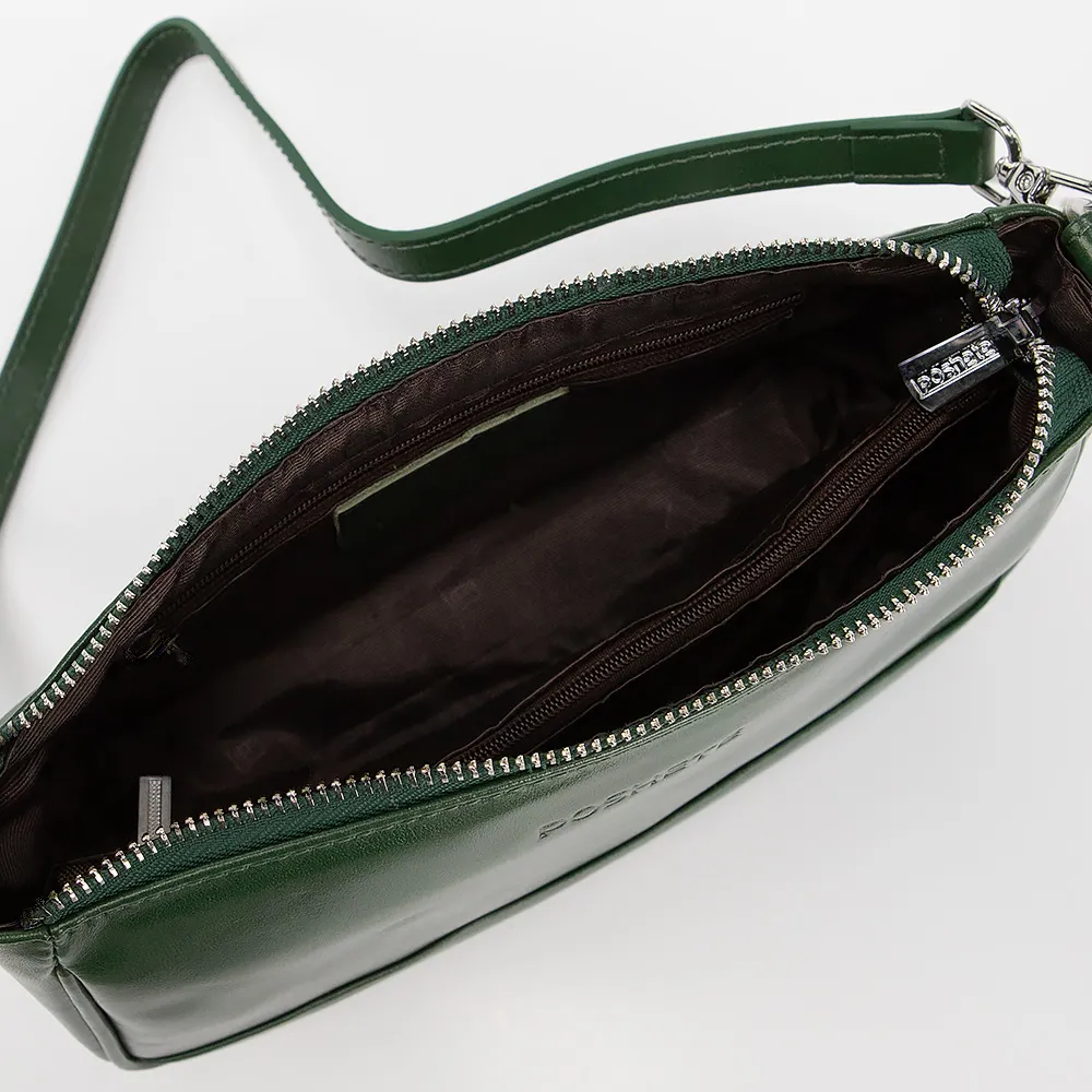 Сумка от торговой марки Poshete выполнена из натуральной кожи зеленого цвета. Модель с длинной ручкой и длинным регулируемым плечевым ремнем. Отделение на молнии. Внутри: текстильная подкладка, карман и средник на молнии, накладной карман. На задней стороне - карман на молнии.