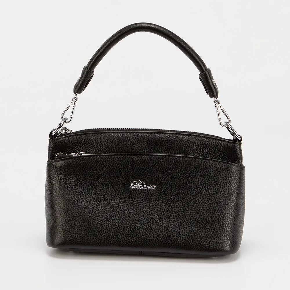 Сумка от торговой марки Francesco Molinary выполнена из натуральной кожи черного цвета. Модель с удлиненной съемной ручкой и длинным регулируемым плечевым ремнем. Отделение на молнии. Внутри: текстильная подкладка, карман и средник на молнии, накладной карман. С лицевой и задней стороны - карман на молнии. Дно оснащено металлическими ножками для защиты от износа.