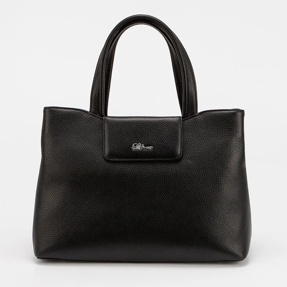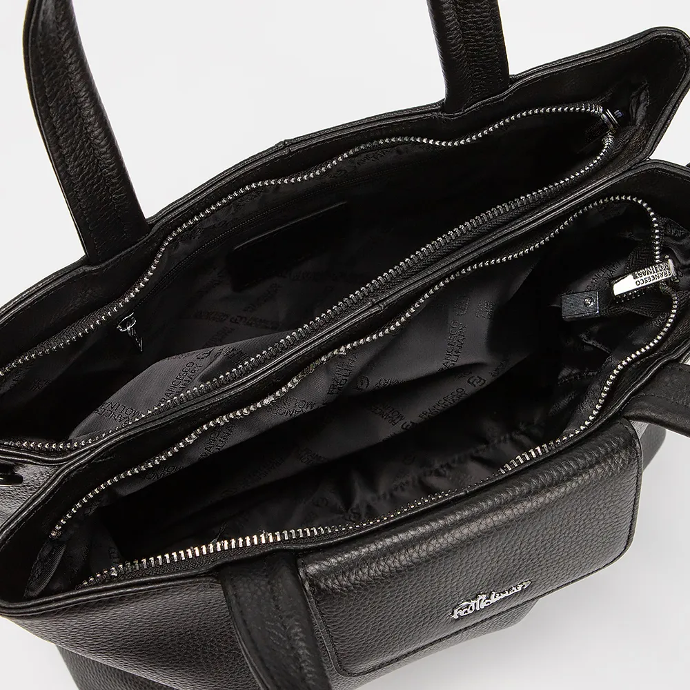 Сумка от торговой марки Francesco Molinary выполнена из натуральной кожи черного цвета. Модель с двумя ручками и длинным регулируемым плечевым ремнем. Два отделения на молнии. Внутри: текстильная подкладка, карман на молнии, накладной карман. С задней стороны - карман на молнии.