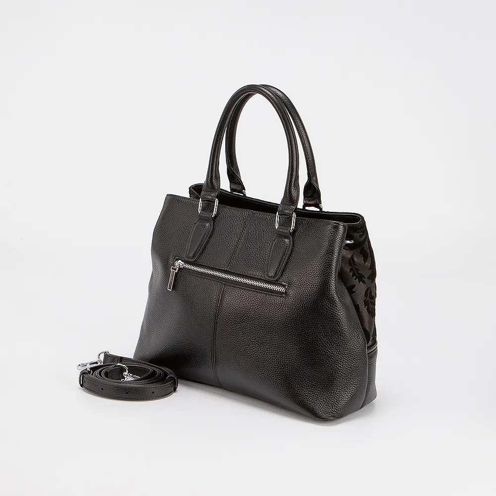 Сумка от торговой марки Francesco Molinary выполнена из натуральной кожи черного цвета. Модель с двумя ручками и съемным регулируемым плечевым ремнем. С лицевой стороны декорирована замшевым цветочным тиснением. Два отделения на молнии. Внутри: текстильная подкладка, карман и средник на молнии, накладной карман. С задней стороны - карман на молнии.