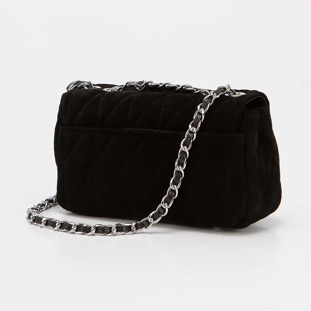 Сумка от торговой марки Francesco Molinary выполнена из натуральной замши черного цвета. Модель с ремнем-цепочкой. Декорирована стежкой. Клапан на поворотном замке закывает два отделения. Внутри: текстильная подкладка, карман на молнии, накладной карман.