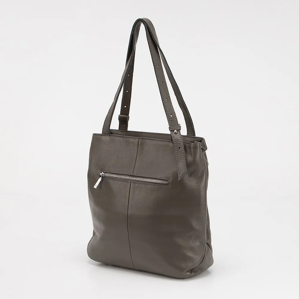 Сумка от торговой марки Poshete из натуральной кожи серого цвета. Модель с двумя длинными регулируемыми ручками. Отделение на молнии. Внутри текстильная подкладка, карман и средник на молнии, накладной карман. На лицевой и задней стороне карман на молнии.