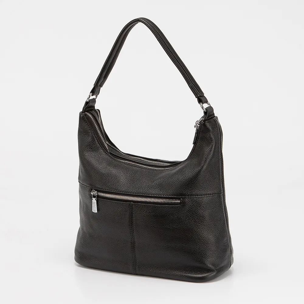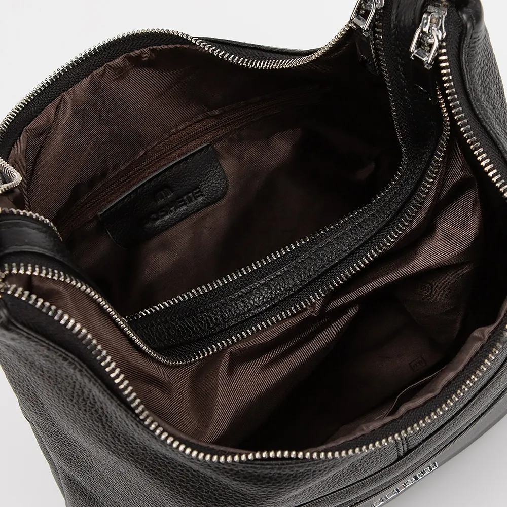 Сумка от торговой марки Poshete из натуральной кожи черного цвета. Модель с удлиненной ручкой. Два отделения на молнии. Внутри текстильная подкладка, карман на молнии, накладной карман. На лицевой и задней стороне карман на молнии.