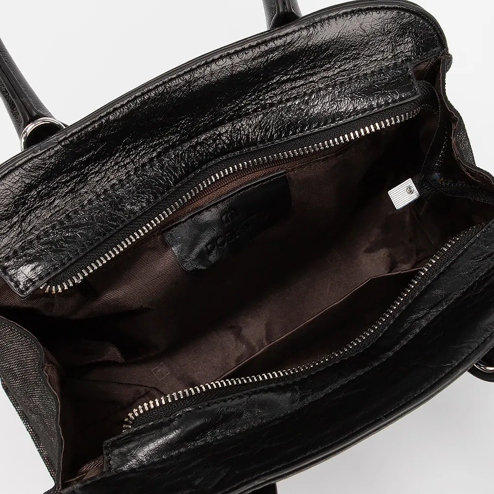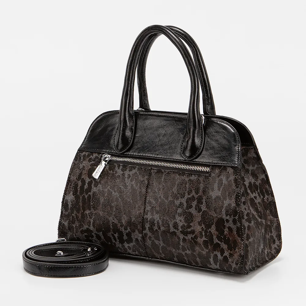 Сумка от торговой марки Poshete из натуральной кожи черного цвета с текстильной вставкой с леопардовым принтом. Модель с двумя плотными ручками и съемным регулируемым плечевым ремнем. Отделение на молнии. Внутри: фирменная подкладка, карман на молнии, накладной карман. На задней стороне - карман на молнии.