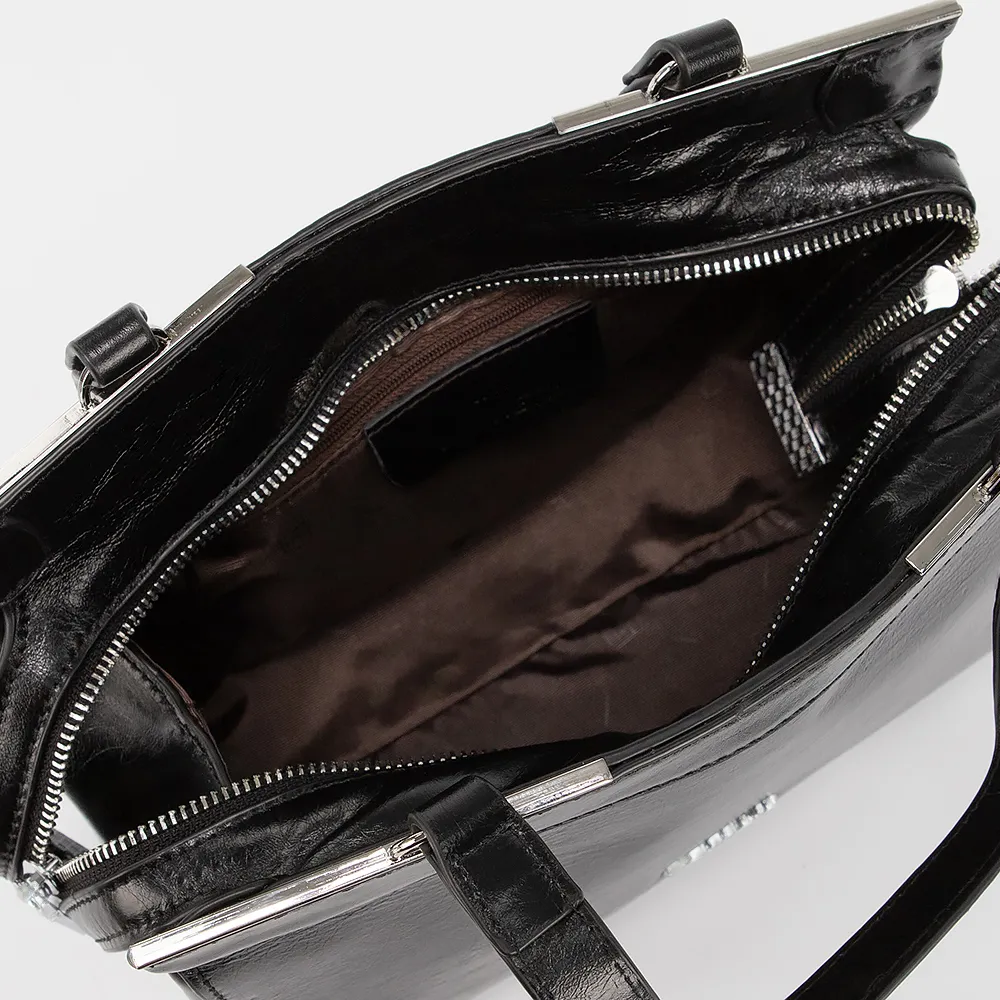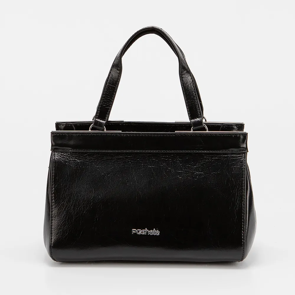 Сумка от торговой марки Poshete из натуральной кожи черного цвета. Модель с двумя ручками и съемным регулируемым плечевым ремнем. Отделение на молнии. Внутри: фирменная подкладка, карман на молнии, накладной карман. На задней стороне - карман на молнии.