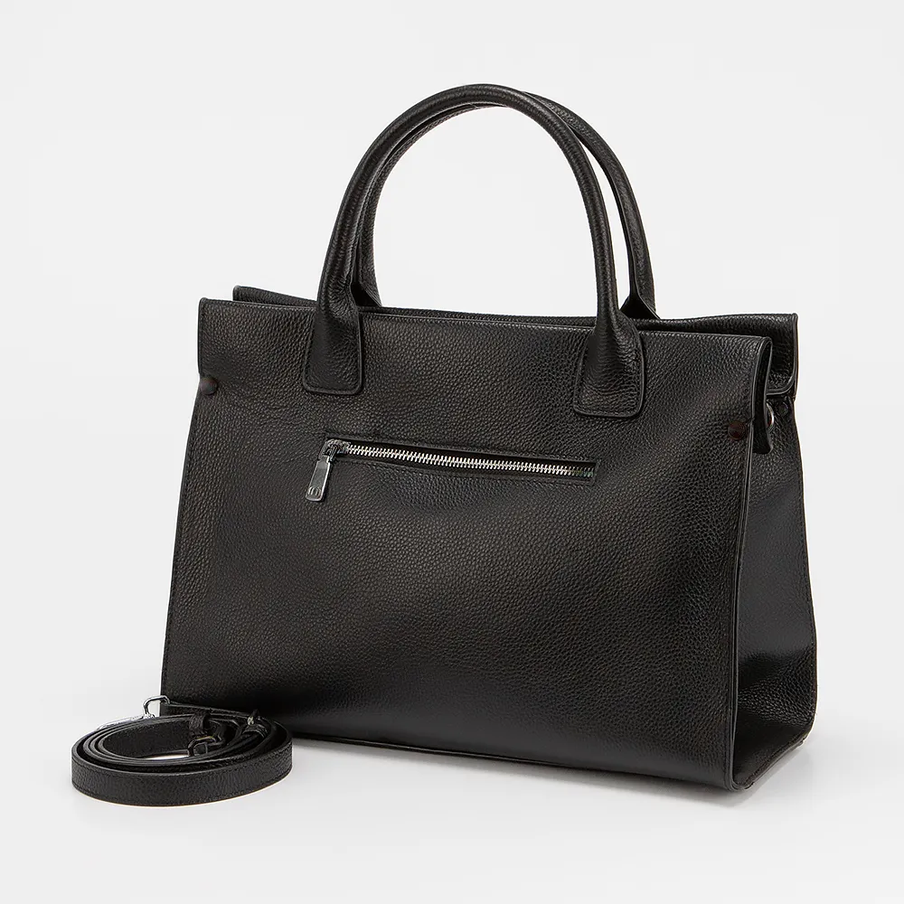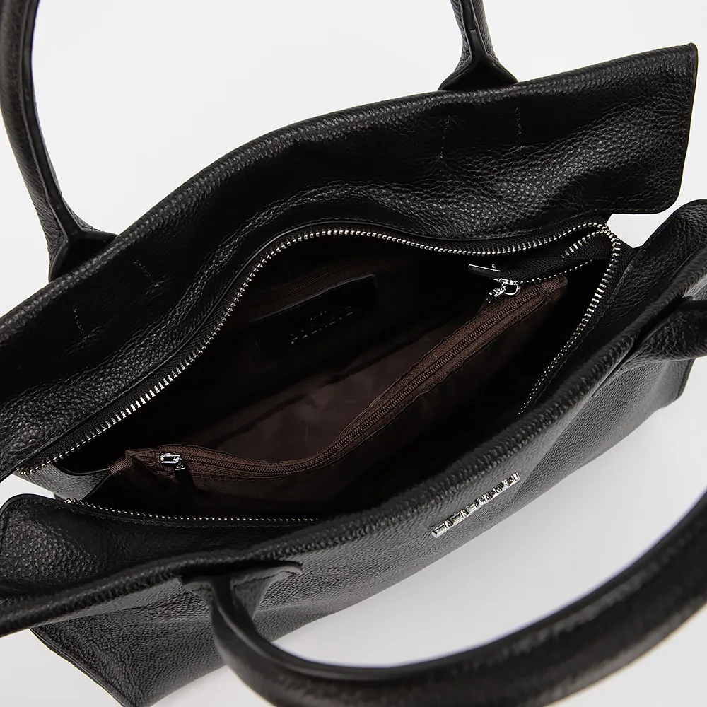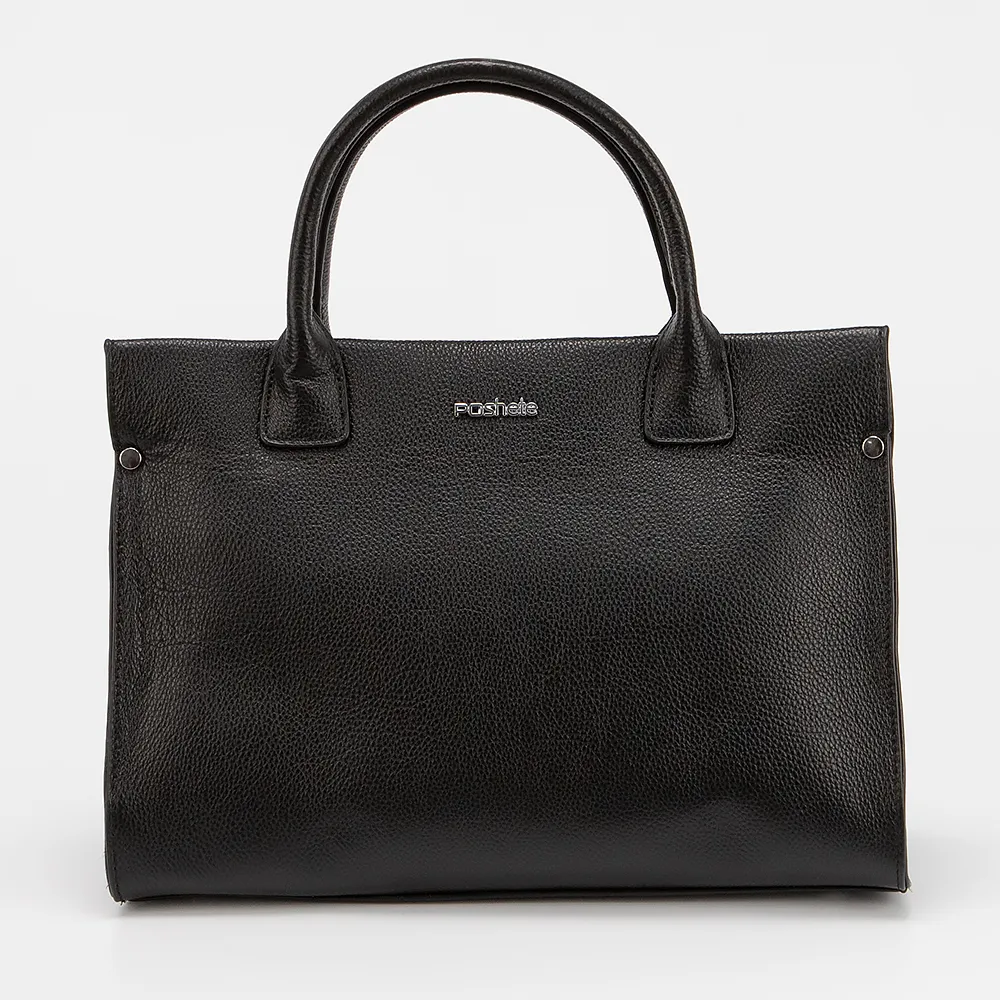 Сумка от торговой марки Poshete из натуральной кожи черного цвета. Модель с двумя ручками и съемным регулируемым плечевым ремнем. Отделение на молнии. Внутри: фирменная подкладка, карман и средник на молнии, накладной карман. На задней стороне - карман на молнии.