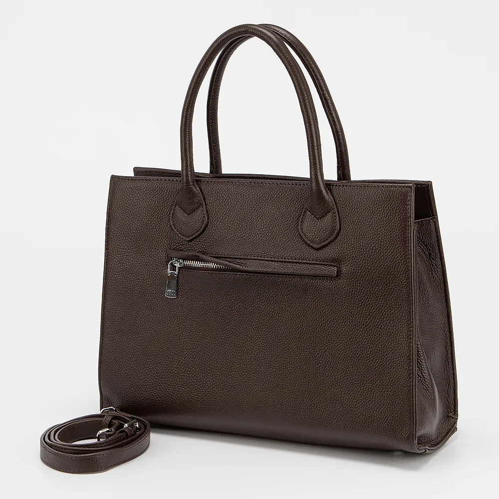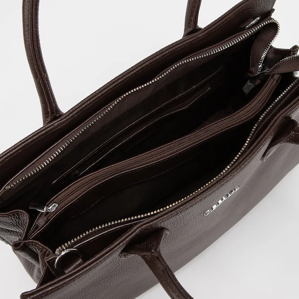 Сумка от торговой марки Poshete из натуральной кожи коричневого цвета. Модель с двумя ручками и съемным регулируемым плечевым ремнем. Отделение на молнии. Внутри: фирменная подкладка, карман и средник на молнии, накладной карман. На задней стороне - карман на молнии.