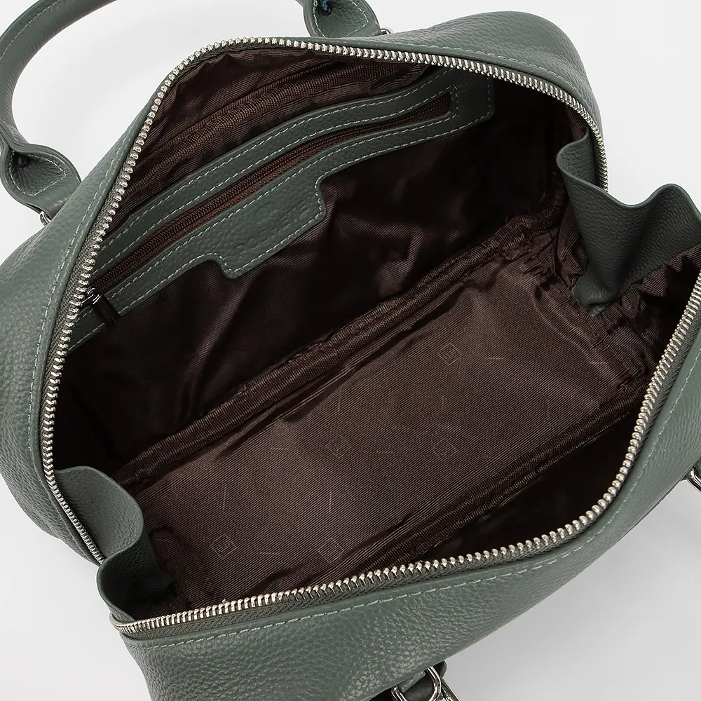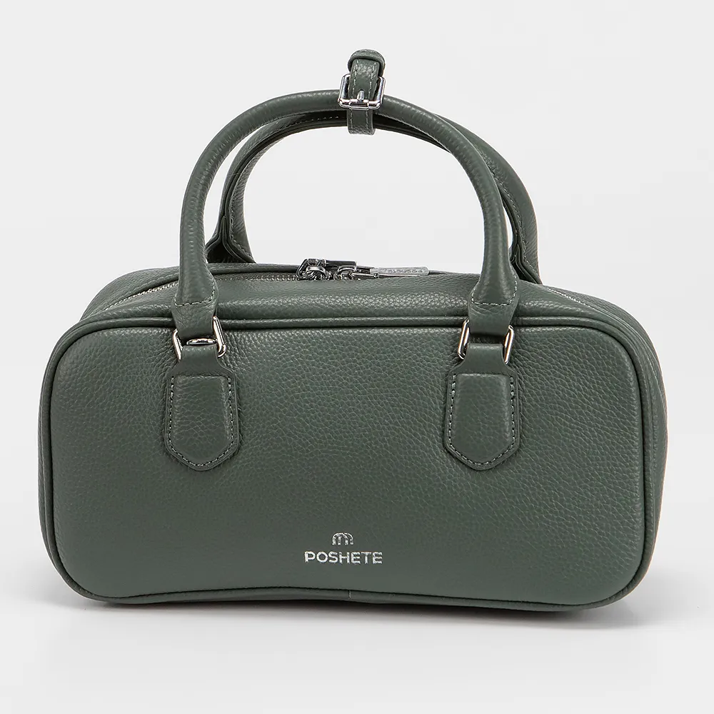 Сумка от торговой марки Poshete из натуральной кожи зеленого цвета. Модель с двумя ручками с фиксатором и съемным регулируемым плечевым ремнем. Отделение на молнии. Внутри: фирменная подкладка, карман на молнии, накладной карман.