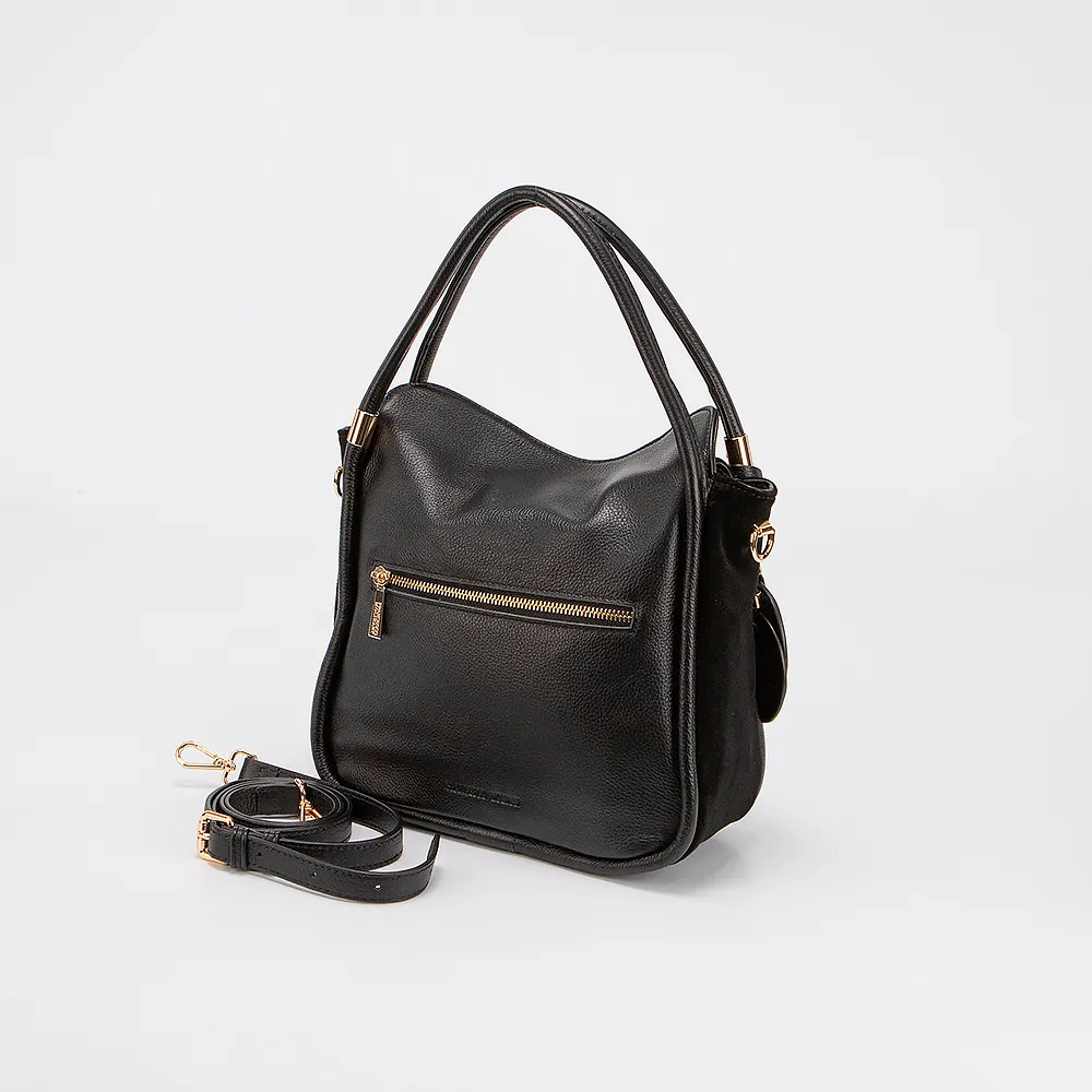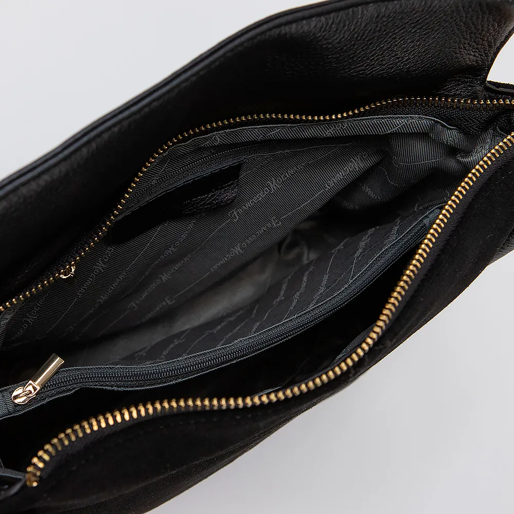 Сумка от торговой марки Francesco Molinary выполнена из натуральной замши и кожи черного цвета. Модель с двумя удлиненными ручками и съемным регулируемым плечевым ремнем. Декорирована кожаной подвеской. Небольшой клапан закрывает отделение на молнии. Внутри: текстильная подкладка, карман и средник на молнии, накладной карман. На задней стороне карман на молнии.
