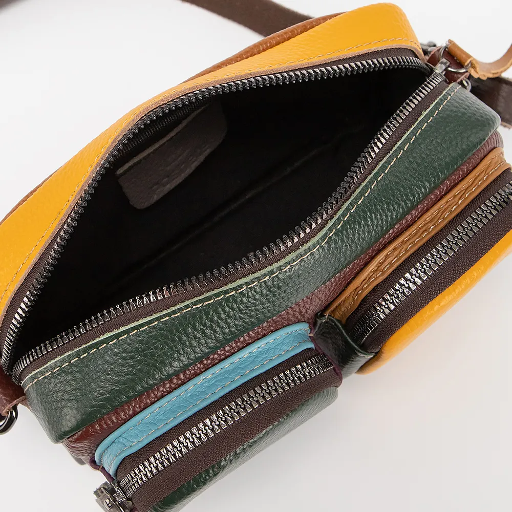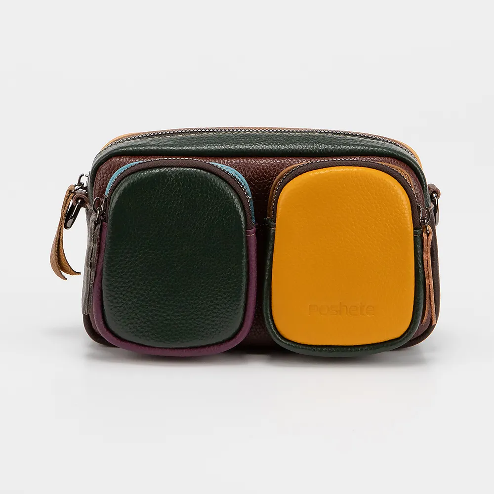 Сумка от торговой марки Poshete выполнена из натуральной кожи в сочетании нескольких цветов. Модель со съемным ремнем из натуральной кожи, в комплекте имеется широкий съемный текстильный ремень. Отделение на молнии. Внутри: текстильная подкладка, карман на молнии, накладной карман. С лицевой стороны два объемных кармана на молнии. На задней стороне - карман на молнии.