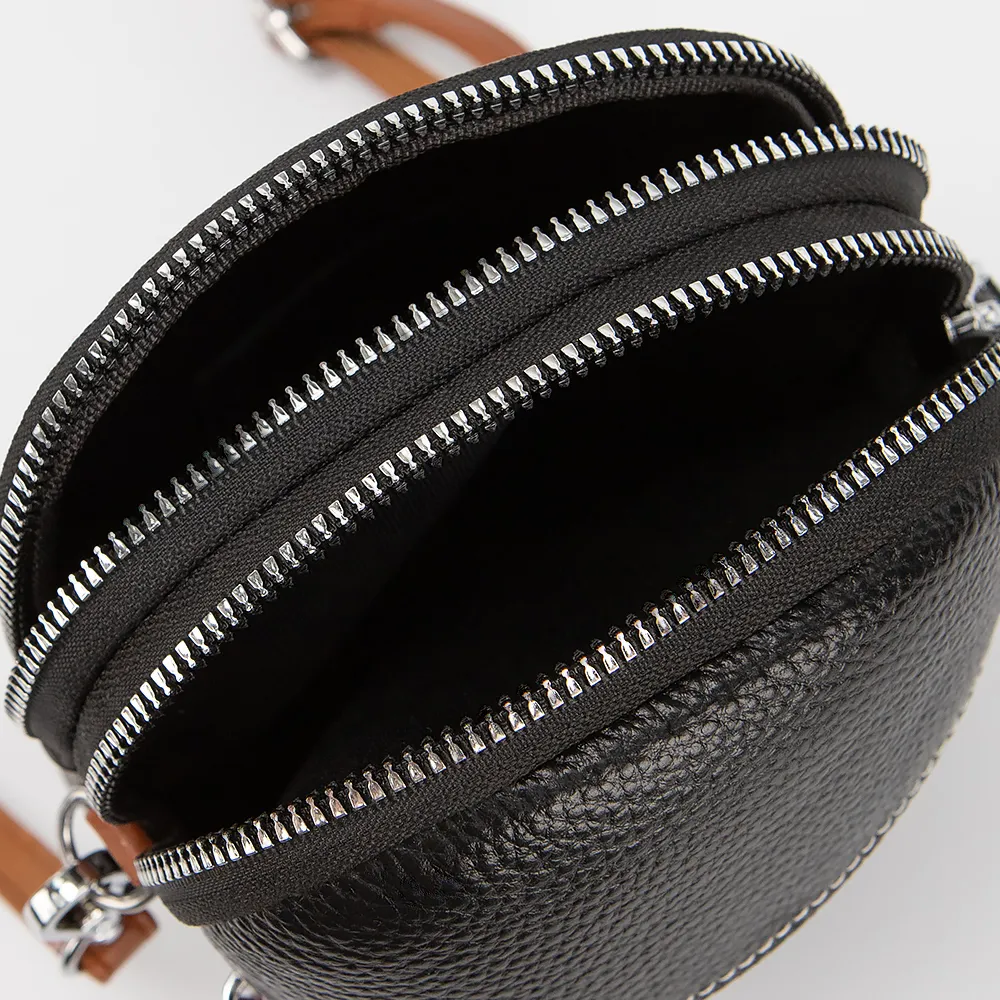 Сумка от торговой марки Poshete выполнена из натуральной кожи черного цвета. Компактная модель вертикальной ориентации со съемным тонким ремешком оранжевого цвета. Два отделения на молнии. С лицевой стороны карман на молнии.