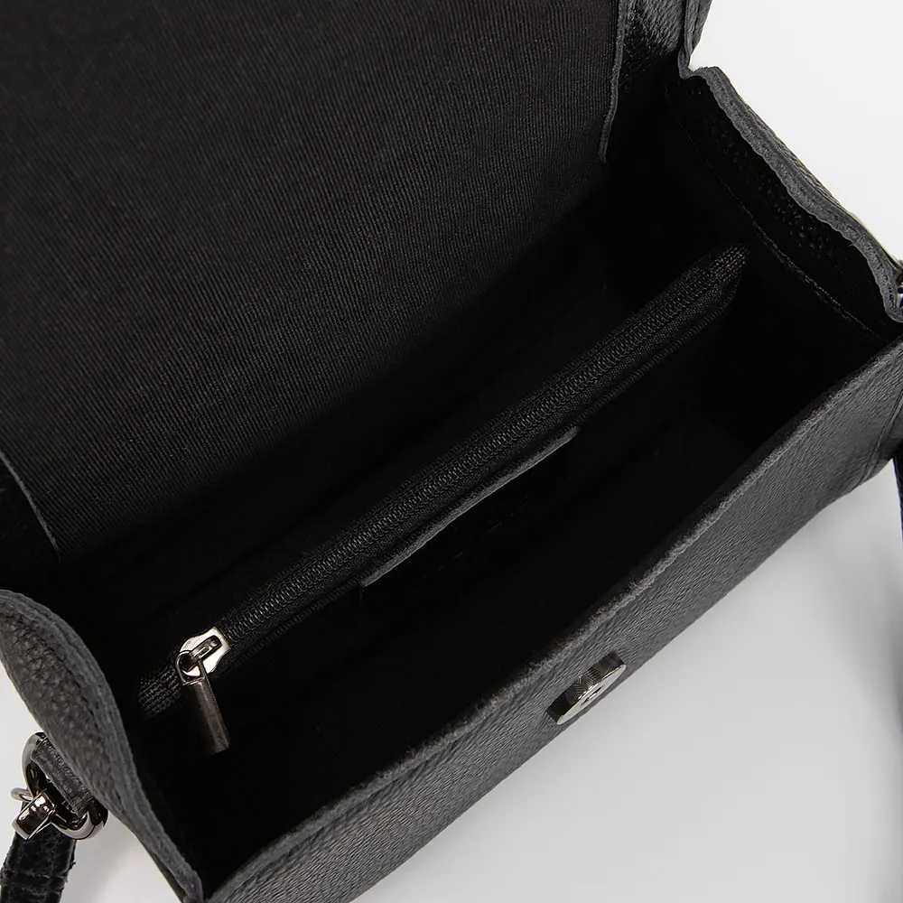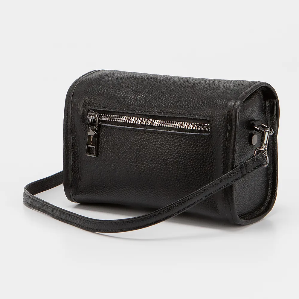 Сумка от торговой марки Poshete выполнена из натуральной кожи черного цвета. Модель с длинным тонким плечевым ремнем. Клапан на магнитной кнопке закрывает отделение с подкладкой и средником на молнии. На задней стороне - карман на молнии.