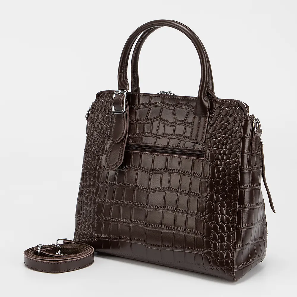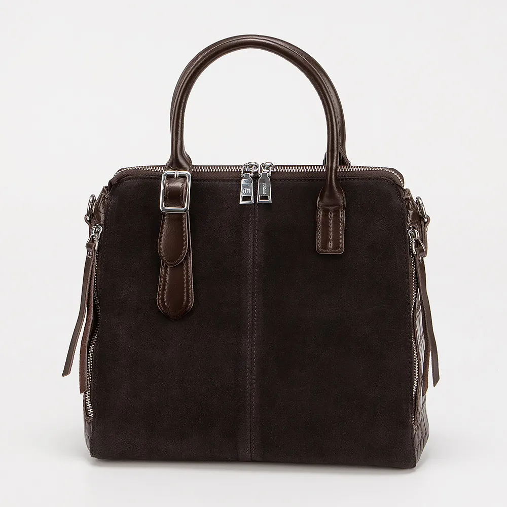 Сумка от торговой марки Poshete изготовлена из натуральной кожи и замши коричневого цвета. Модель с двумя плотными ручками и съемным регулируемым плечевым ремнем. Отделение на молнии. Внутри: фирменная подкладка, средник и карман на молнии, два накладных кармана. На задней стороне - карман на молнии. По бокам - вертикальный карман на молнии. Дно оснащено металлическими ножками для защиты от износа. Сумка подходит для документов формата А4.