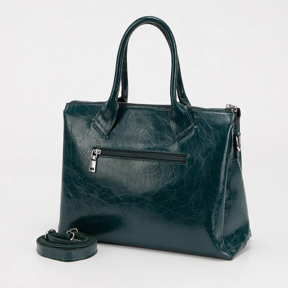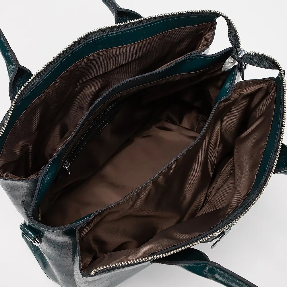 Сумка от торговой марки Poshete изготовлена из натуральной кожи зеленого цвета. Модель с двумя ручками и съемным плечевым ремнем. Отделение на молнии. Внутри: три отсека, текстильная подкладка, карман на молнии, накладной карман. На задней стороне - карман на молнии.