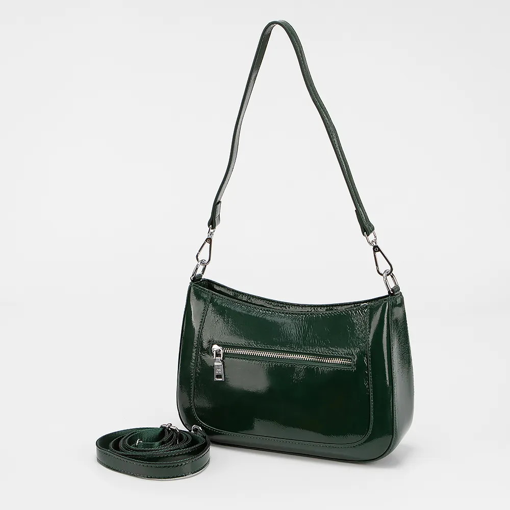 Сумка от торговой марки Poshete изготовлена из натуральной лакированной кожи зеленого цвета. Модель с удлиненной ручкой и съемным регулируемым плечевым ремнем. Отделение на молнии. Внутри: текстильная подкладка, карман и средник на молнии, накладной карман. На задней стороне - карман на молнии.