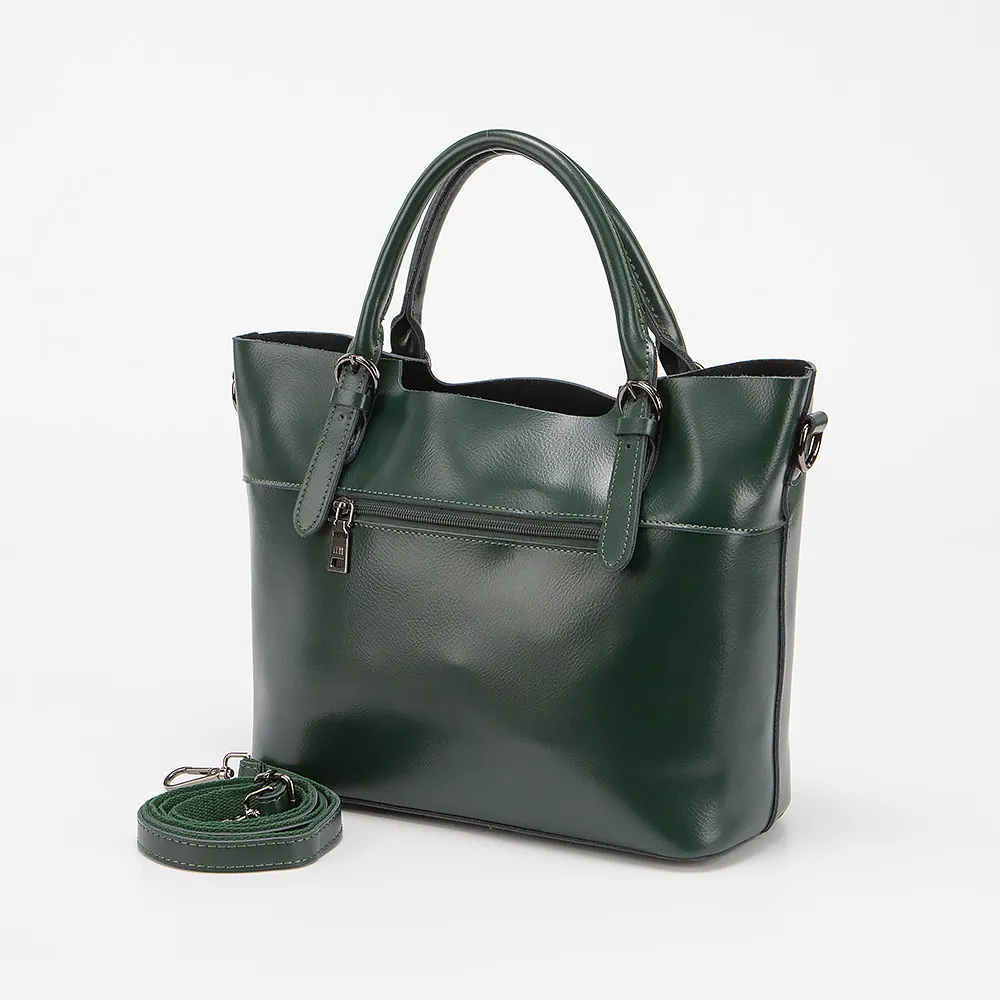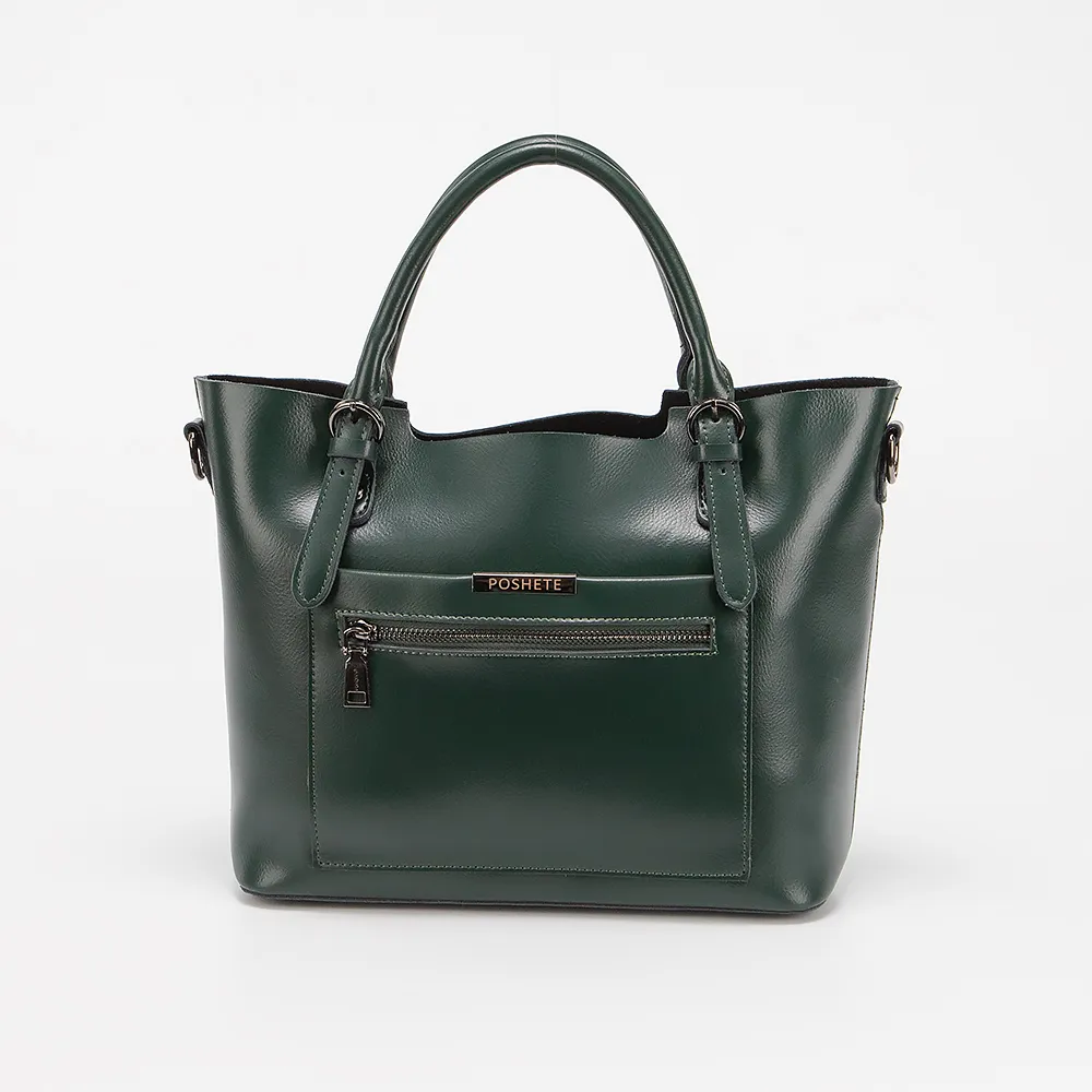 Сумка от торговой марки Poshete выполнена из натуральной кожи зеленого цвета. Модель в форме трапеции, с двумя удлиненными плотными ручками и съемным плечевым ремнем. Отделение на молнии. Внутри: средник и карман на молнии, накладной карман. На передней стороне - карман на молнии и накладной карман без застежки. На задней стороне - карман на молнии. Дно сумки оснащено металлическими ножками для защиты от износа.