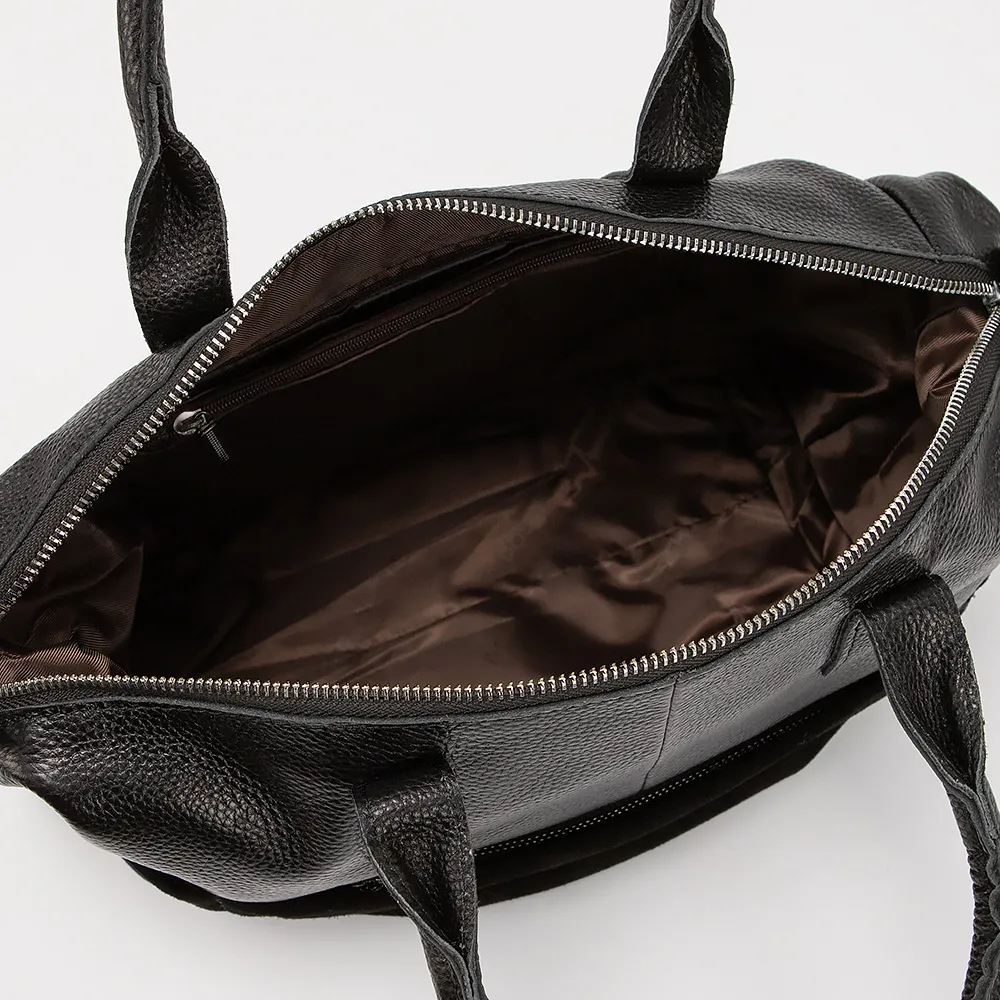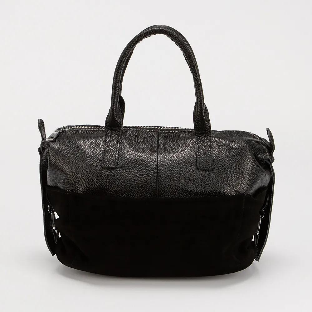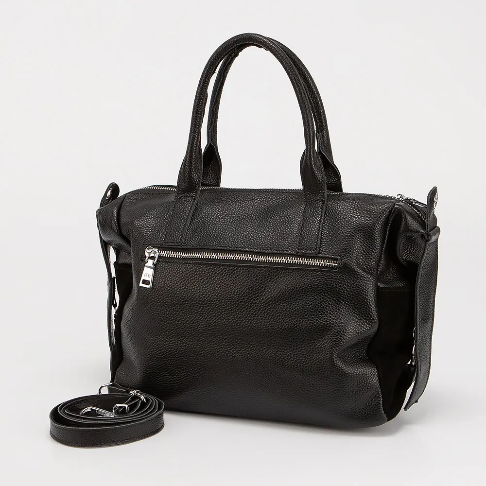 Сумка от торговой марки Poshete изготовлена из натуральной кожи и замши черного цвета. Модель с двумя ручками и съемным регулируемым плечевым ремнем. Отделение на молнии. Внутри: текстильная подкладка, карман на молнии, накладной карман. На лицевой и задней стороне - карман на молнии.