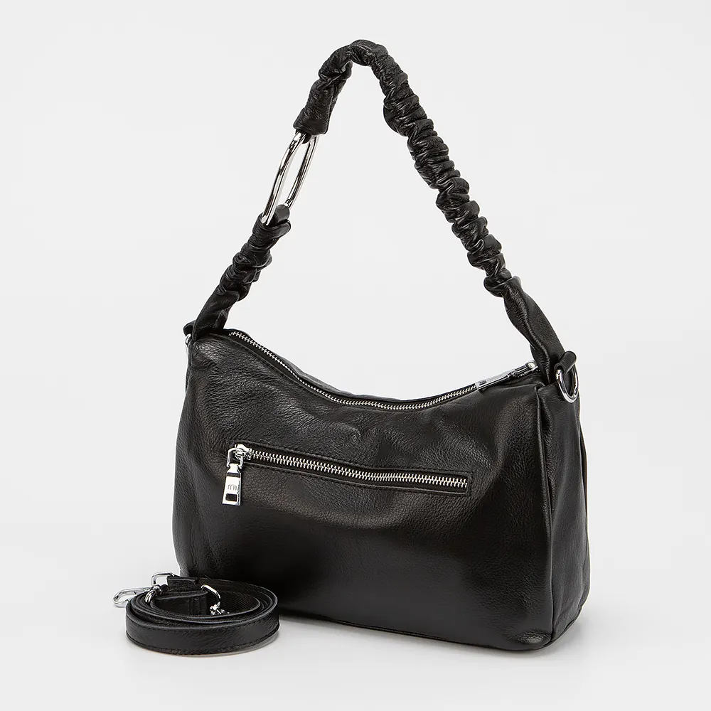 Сумка от торговой марки Poshete изготовлена из натуральной кожи черного цвета. Модель с удлиненной ручкой и съемным регулируемым плечевым ремнем. Отделение на молнии. Внутри: текстильная подкладка, карман и средник на молнии, накладной карман. На задней стороне - карман на молнии.