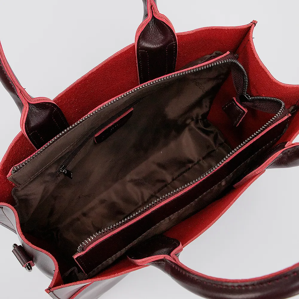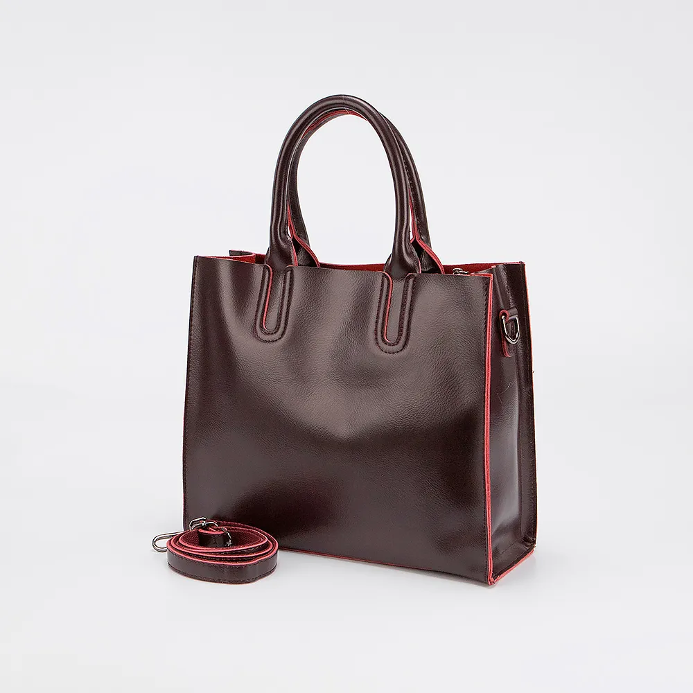 Сумка от торговой марки Poshete из натуральной кожи бордового цвета. Модель с двумя ручками и съемным регулируемым плечевым ремнем. Отделение на молнии. Внутри: текстильная подкладка, карман на молнии, накладной карман. Дно оснащено металлическими ножками для защиты от износа.