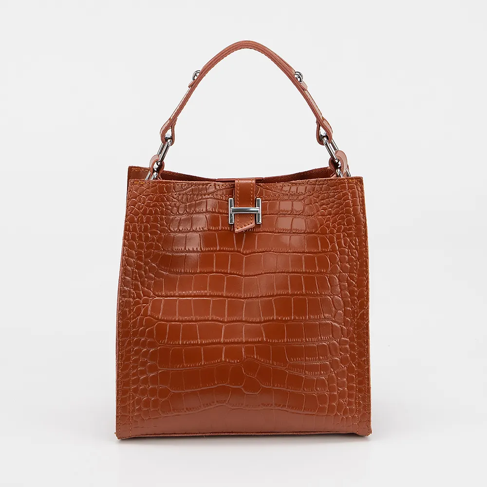 Сумка от торговой марки Poshete из натуральной кожи коричневого цвета. Лицевая сторона декорирована тиснением под кожу крокодила. Компактная модель вертикальной ориентации с одной ручкой, съемным регулируемым плечевым кожаным ремнем и съемным нерегулируемым плечевым ремнем, выполненным из текстильного материала с узорным рисунком. Три отделения с частичной подкладкой. Крайние фиксируются магнитной кнопкой. Среднее отделение на молнии. Внутри: карман на молнии, два накладных кармана. Дно оснащено металлическими ножками для защиты от износа.