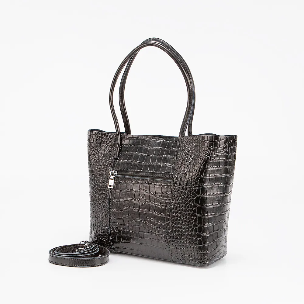 Сумка от торговой марки Poshete из натуральной кожи черного цвета с тиснением под рептилию. Модель с двумя удлиненными ручками и съемным регулируемым плечевым ремнем. Отделение на молнии. Внутри: текстильная подкладка, два кармана на молнии, накладной карман. На задней стороне - карман на молнии. Дно оснащено металлическими ножками для защиты от износа.