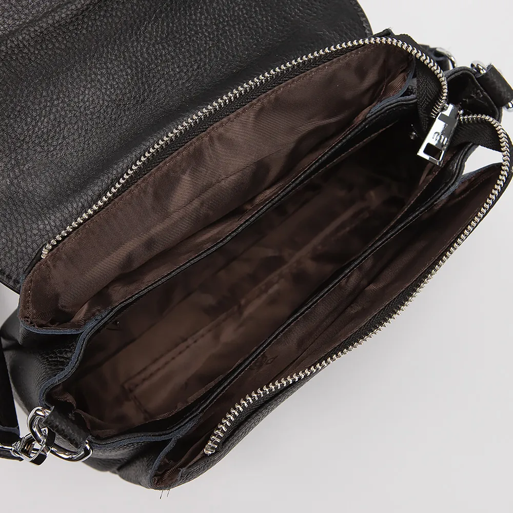 Сумка от торговой марки Poshete выполнена из натуральной кожи черного цвета. Модель с удлиненной ручкой и съемным регулируемым плечевым ремнем. Клапан закрывает отделение на молнии. Внутри: три отсека, текстильная подкладка. На задней стороне - карман на молнии.