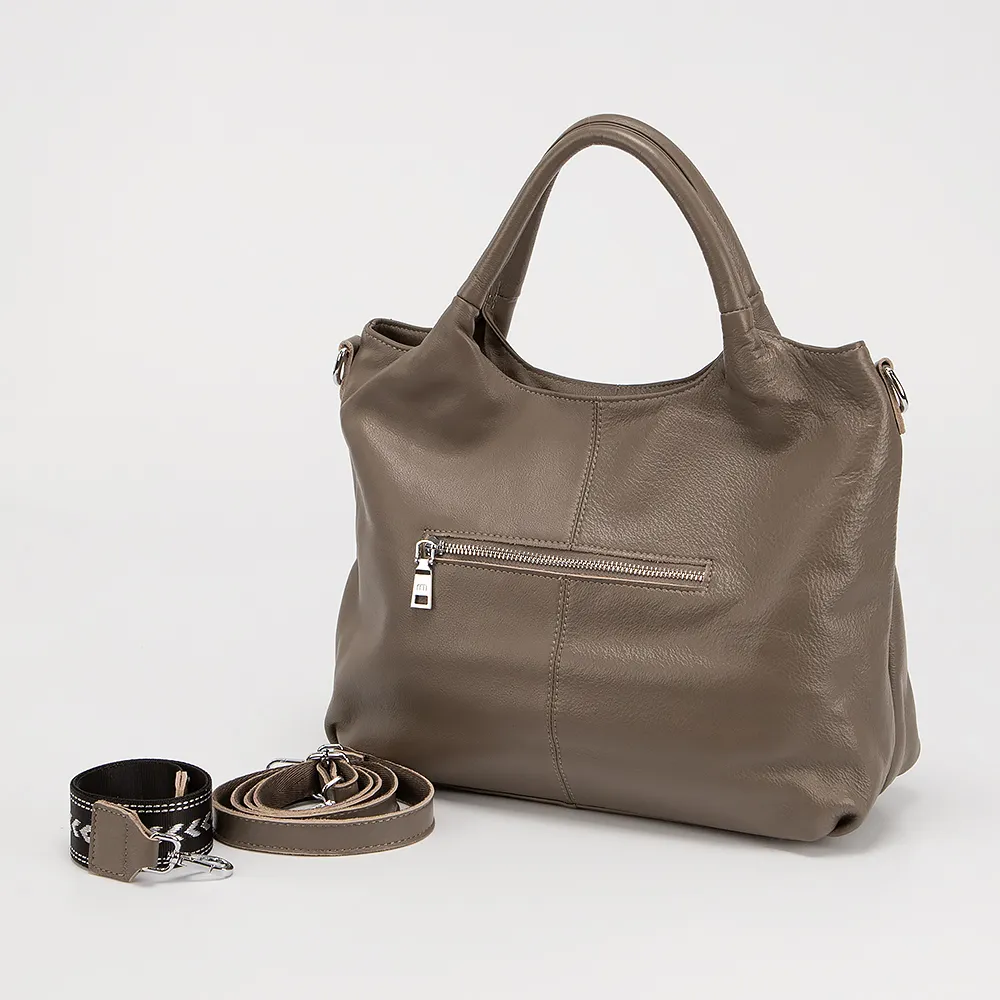 Сумка от торговой марки Poshete из натуральной кожи серого цвета. Компактная модель с удлиненной съемной ручкой-цепочкой. Внутри: фирменная подкладка, карман на молнии, накладной карман. На задней стороне - карман на молнии.