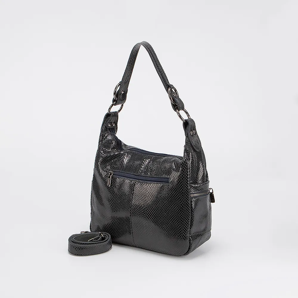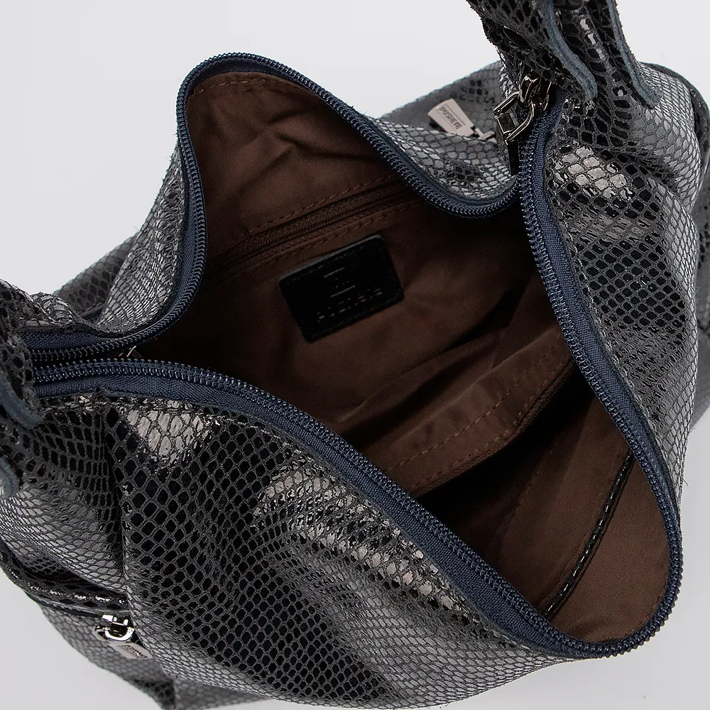 Сумка от торговой марки Poshete выполнена из натуральной кожи серого цвета с лазерной обработкой и тиснением под рептилию. Модель с удлиненной ручкой и съемным регулируемым плечевыми ремнем. Отделение на молнии. Внутри: текстильная подкладка, карман и средник на молнии, накладной карман. По бокам - накладной карман без застежки, декорирован молнией. На задней стороне - карман на молнии.