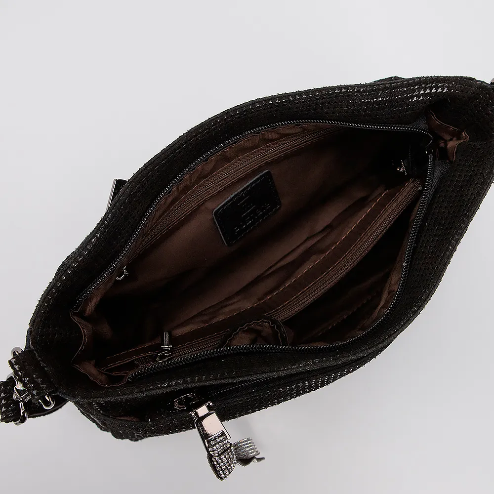 Сумка от торговой марки Poshete выполнена из натуральной кожи черного цвета. Модель с удлиненной ручкой и длинным регулируемым плечевым ремнем. Отделение на молнии. Внутри: текстильная подкладка, карман и средник на молнии, накладной карман. На лицевой и задней стороне - карман на молнии.