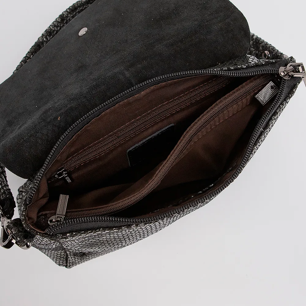 Сумка от торговой марки Poshete выполнена из натуральной кожи серого цвета с лазерной обработкой и тиснением под рептилию. Модель с длинной ручкой и съемным регулируемым плечевым ремнем. Клапан на магнитной кнопке закрывает отделение на молнии. Внутри: текстильная подкладка, карман и средник на молнии, накладной карман. На задней стороне - карман на молнии.