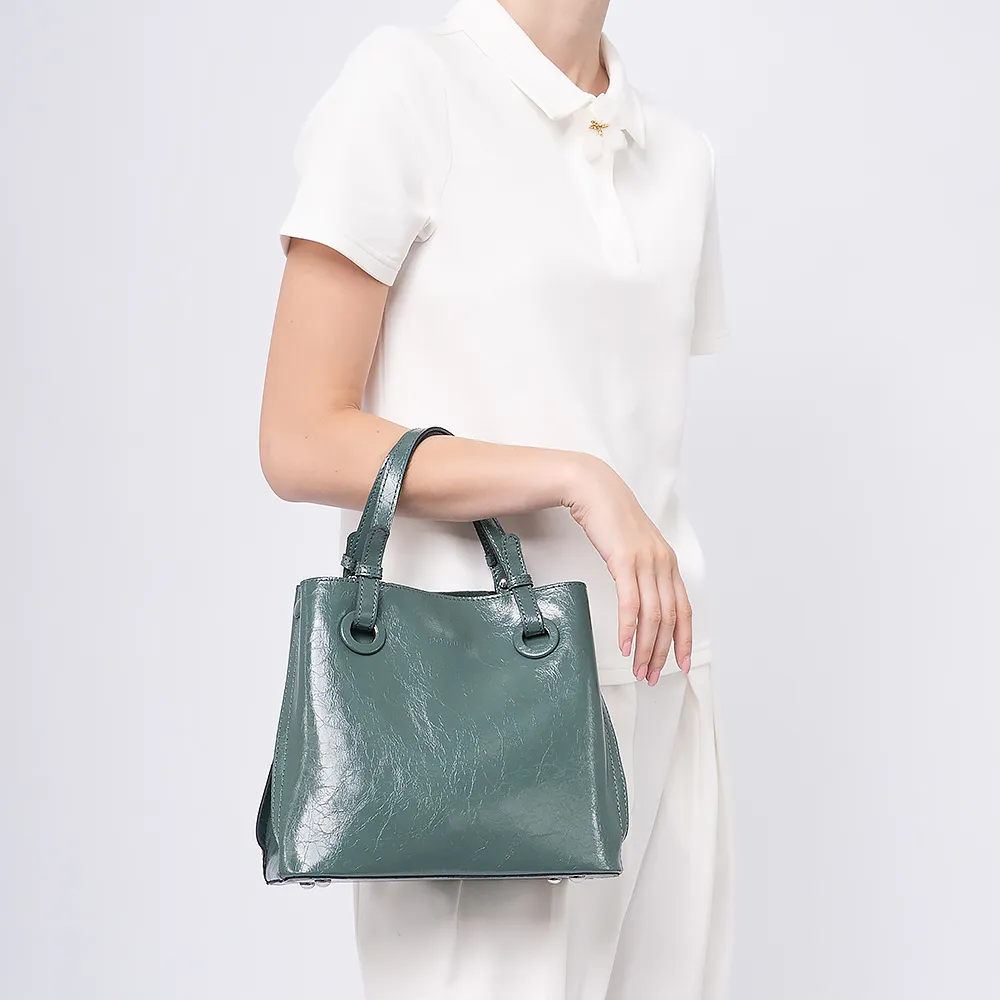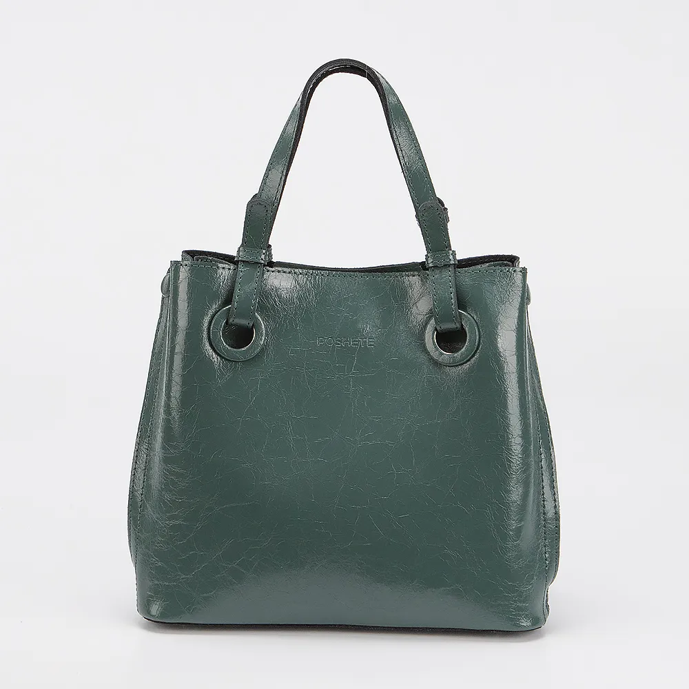 Сумка от торговой марки Poshete из натуральной кожи зеленого цвета с эффектом pull up. Компактная модель с двумя ручками и съемным регулируемым плечевым ремнем. Три отделения с частичной подкладкой, крайние фиксируются магнитной кнопкой. Среднее отделение на молнии, внутри: карман на молнии, два накладных кармана. Дно оснащено ножками для защиты от износа.