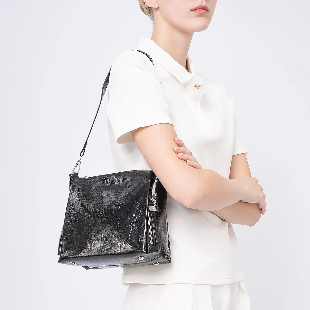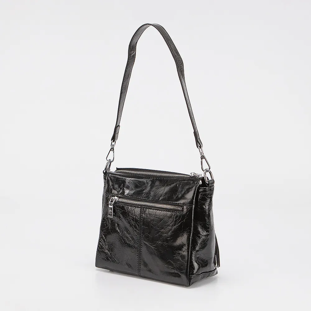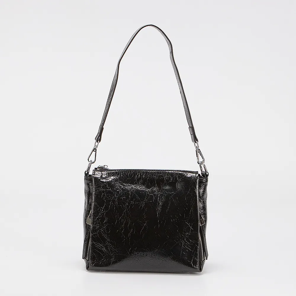 Сумка от торговой марки Poshete из натуральной кожи черного цвета. Модель с длинной ручкой и съемным регулируемым плечевым ремнем. Отделение на молнии. Внутри: три отсека, текстильная подкладка, карман на молнии. С лицевой стороны - два вертикальных кармана на молнии. С задней стороны - карман на молнии. Дно оснащено металлическими ножками для защиты от износа.