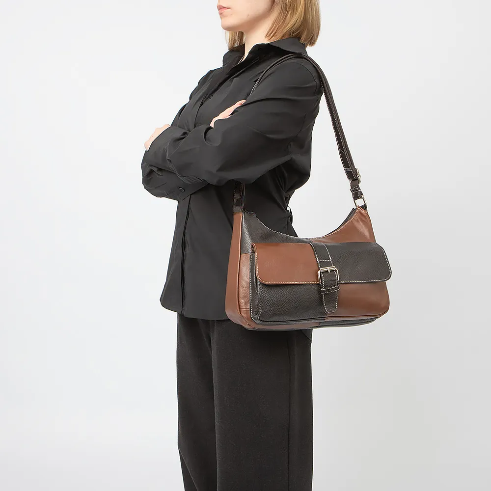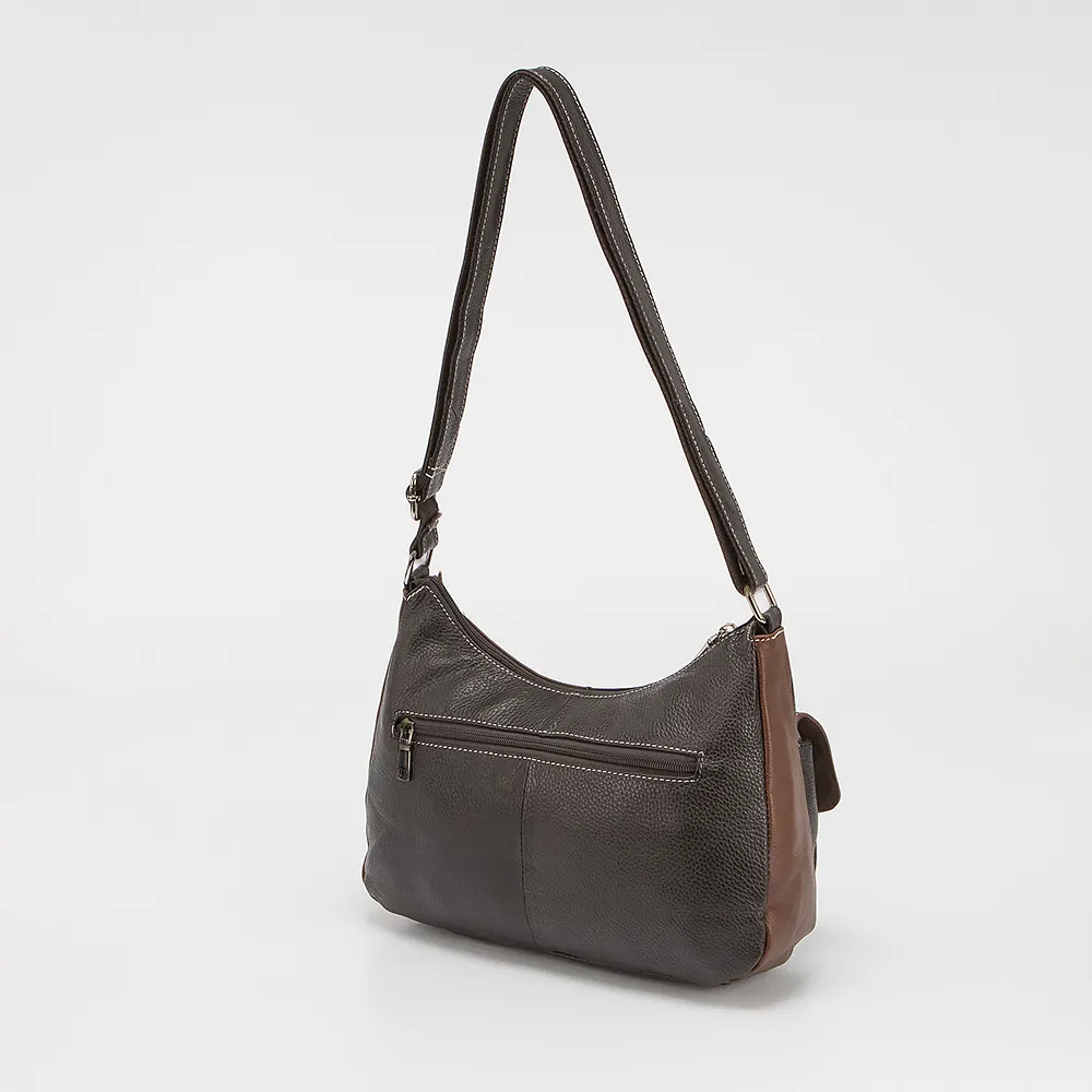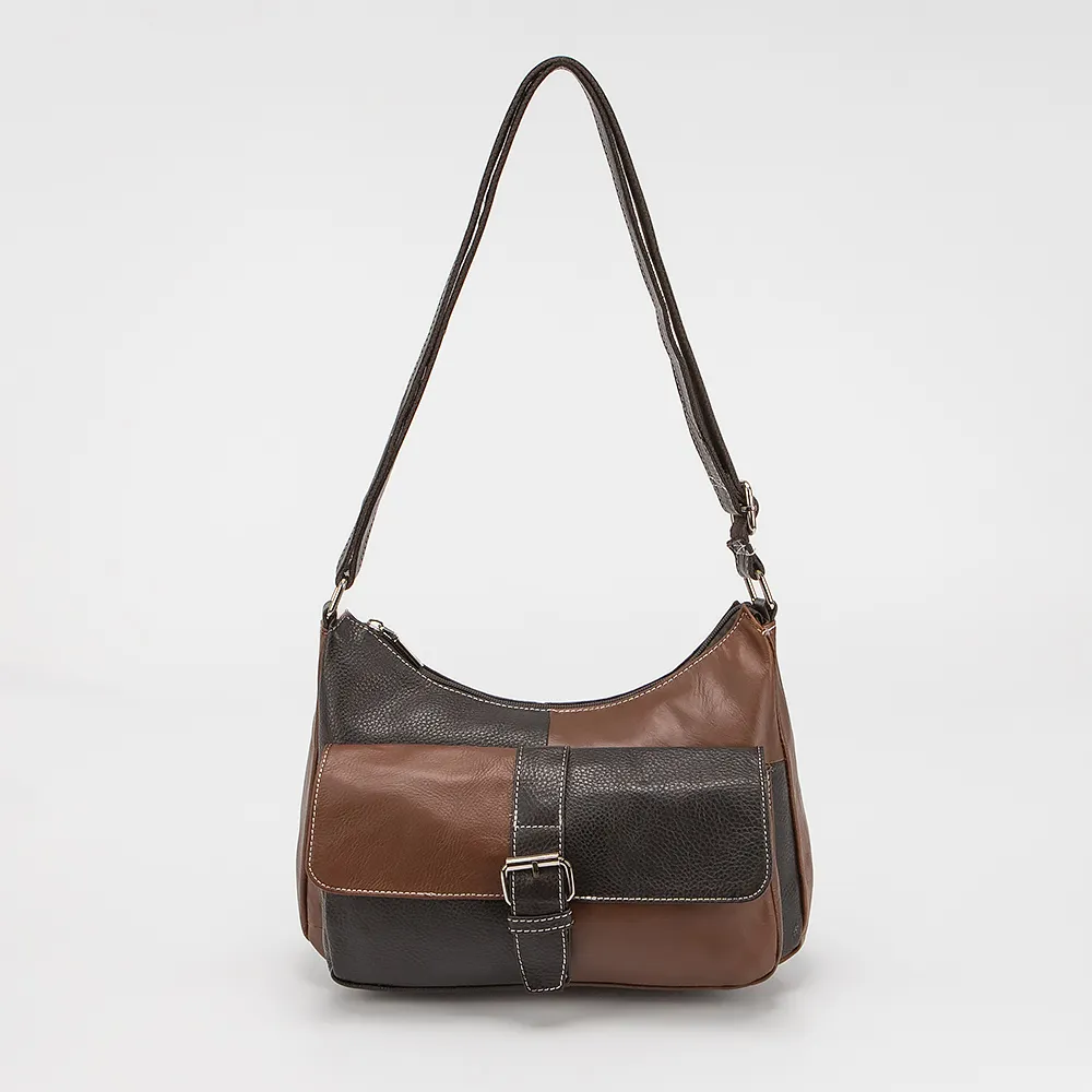 Сумка от торговой марки Poshete из натуральной кожи коричневого цвета. Модель с несъемным регулируемым плечевым ремнем. Отделение на молнии. Внутри: фирменная подкладка, карман на молнии, два накладных кармана, перегородка с карманом на молнии, образующая накладной карман. На лицевой стороне - накладной карман на магнитной кнопке. Клапан декорирован ремешком с пряжкой.