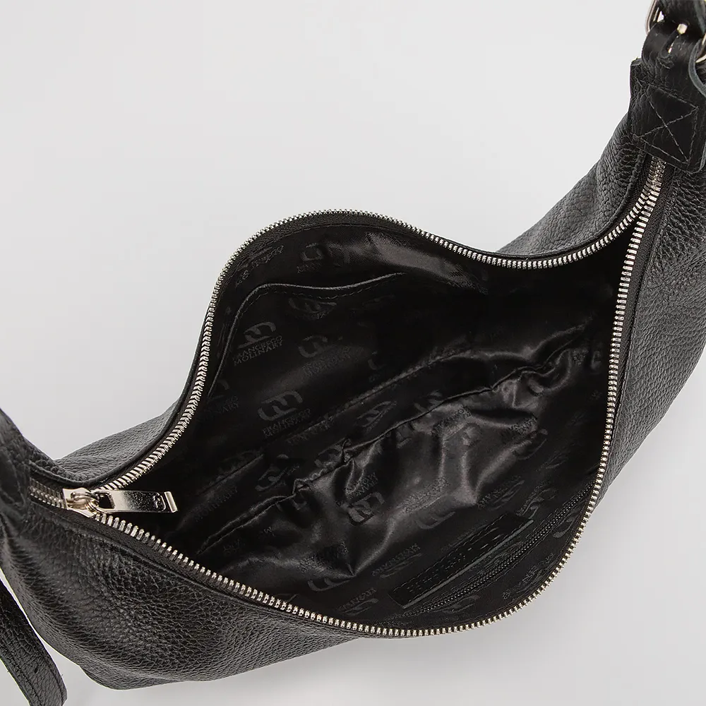 Сумка от торговой марки Francesco Molinary из натуральной кожи черного цвета. Модель оригинальной формы с длинной регулируемой ручкой. Отделение на молнии. Внутри: отсек с фирменной подкладкой, карман на молнии, накладной карман.