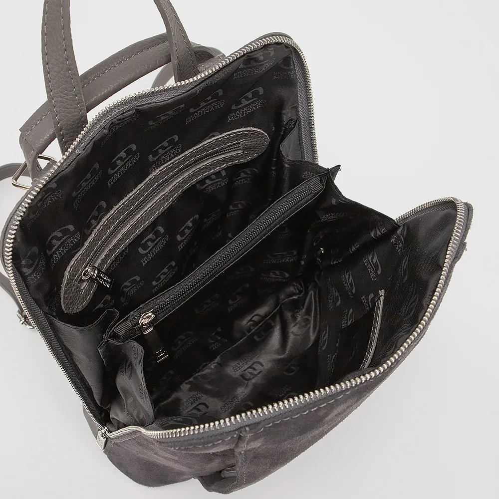 Сумка-рюкзак от торговой марки Francesco Molinary выполнена из натуральной кожи и замши в сочетании синего и серого цвета. Модель с ручкой и ремнем, который стягивается в две плечевые лямки. Отделение на молнии, раскрывается по трем сторонам, открытие регулируется вытачками. Внутри: фирменная подкладка, карман и средник на молнии, накладной карман. На лицевой стороне - два вертикальных кармана на молнии. На задней стороне - карман на молнии. Дно оснащено металлическими ножками для защиты от износа.