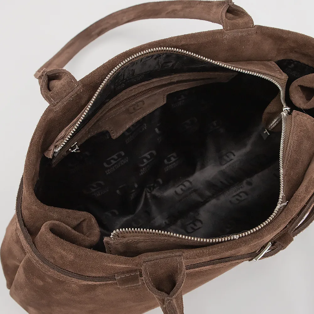 Сумка от торговой марки Francesco Molinary из натуральной замши коричневого цвета. Модель с двумя длинными ручками. Отделение на молнии. Внутри: фирменная подкладка, карман на молнии, накладной карман. Дно оснащено металлическими ножками для защиты от износа.