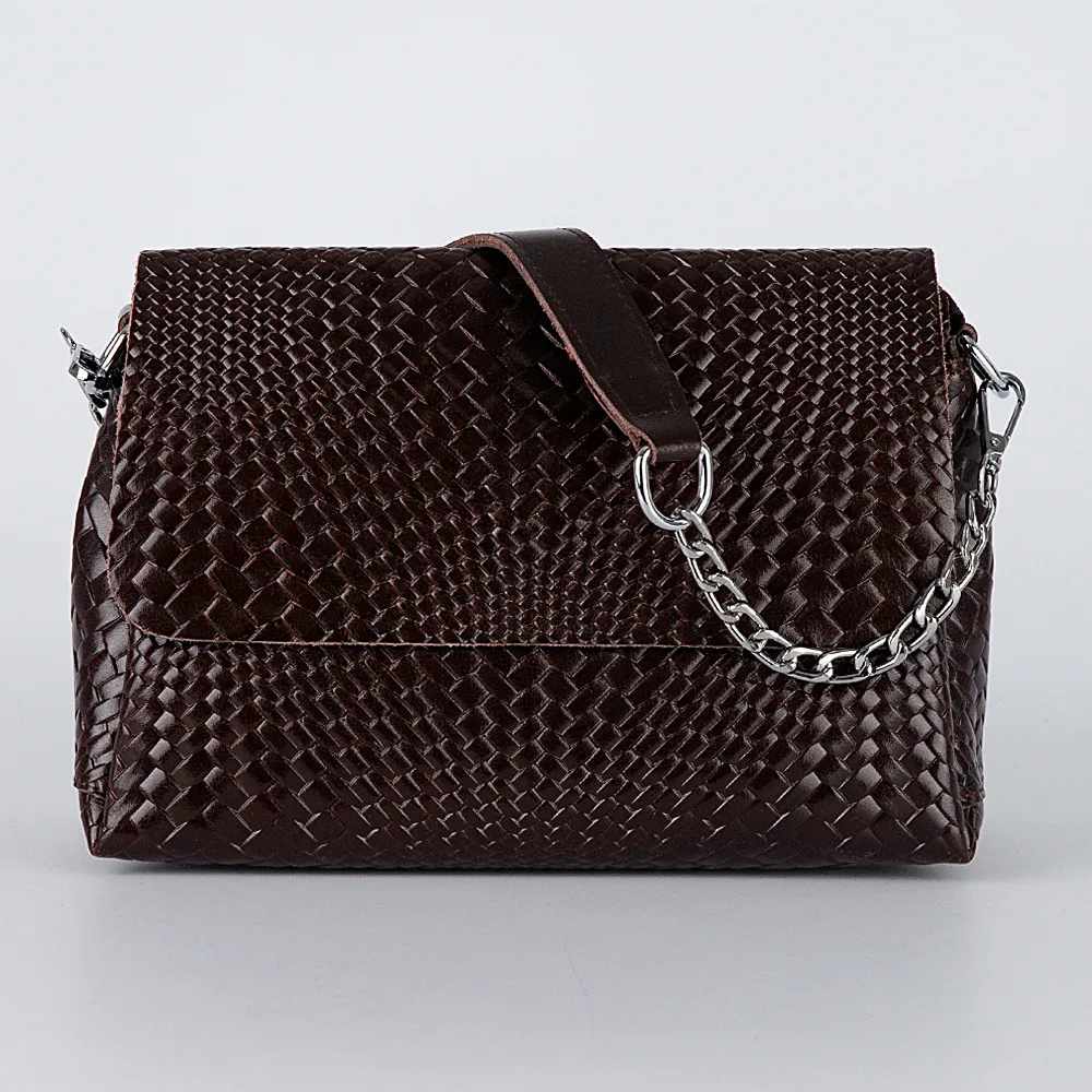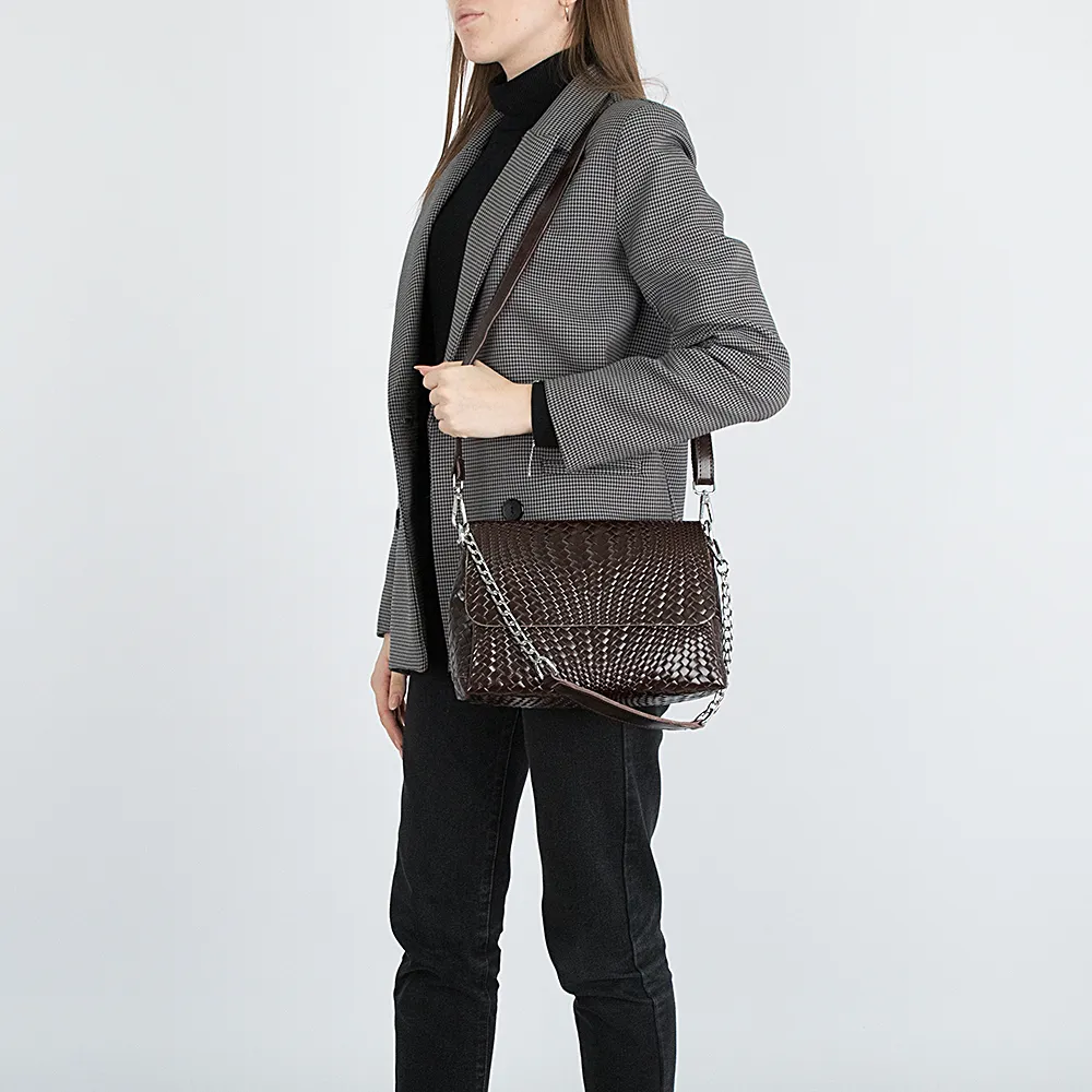 Сумка от торговой марки Poshete выполнена из натуральной кожи темно-коричневого цвета с тиснением под плетение. Модель с ручкой в виде ремешка с цепочкой и съемным регулируемым плечевым ремнем. Закрывается клапаном на магнитной кнопке. Молния закрывает отделения, в среднем – карман на молнии и два накладных кармана. На задней стороне – карман на молнии.